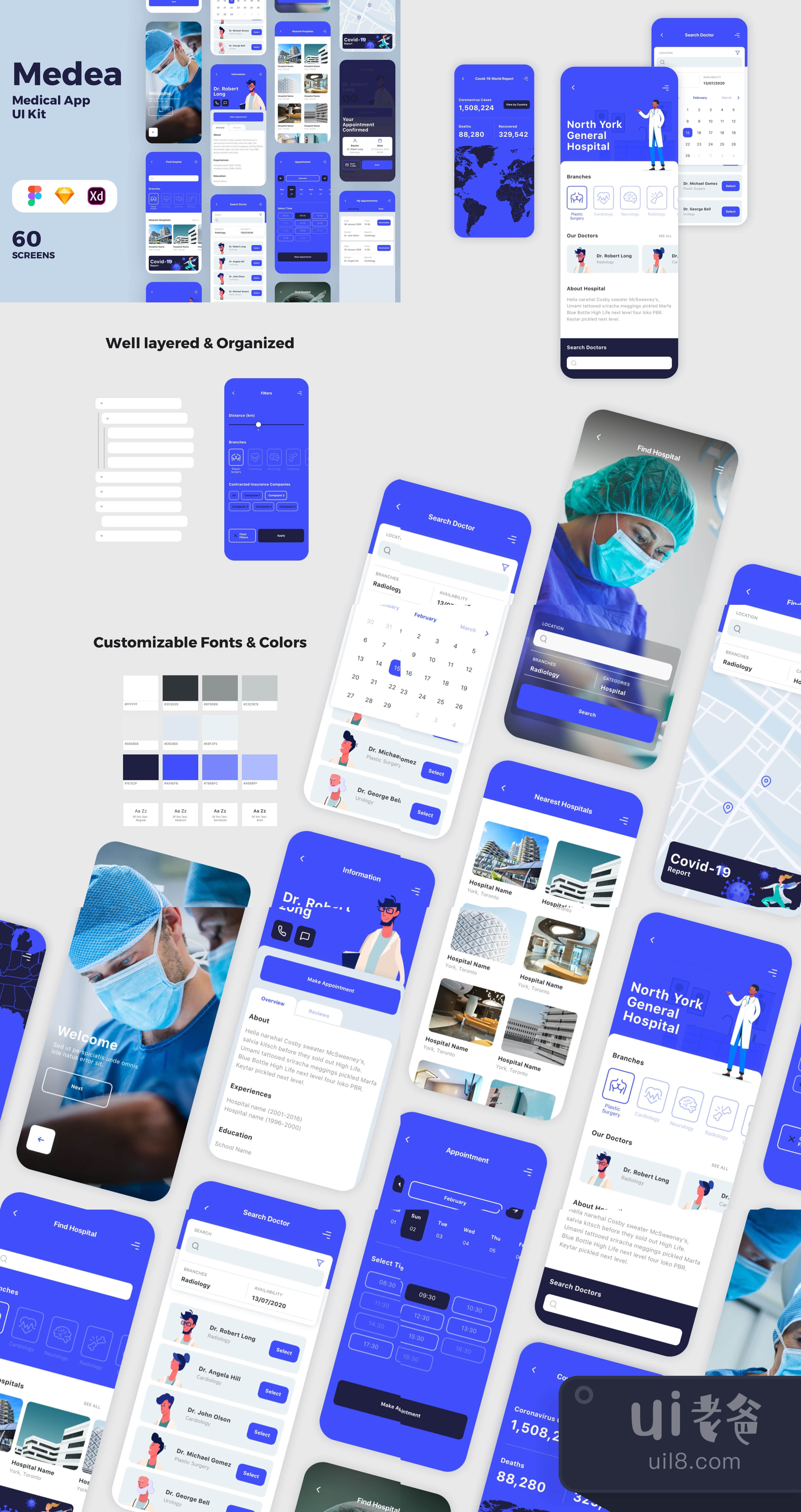 Medea is a Medical App UI Kit. Sketch & Adobe XD & Figma files included. Each screen is fully customizable and well organized in symbols. Covid-19 report screens included. It contains 60 screens.