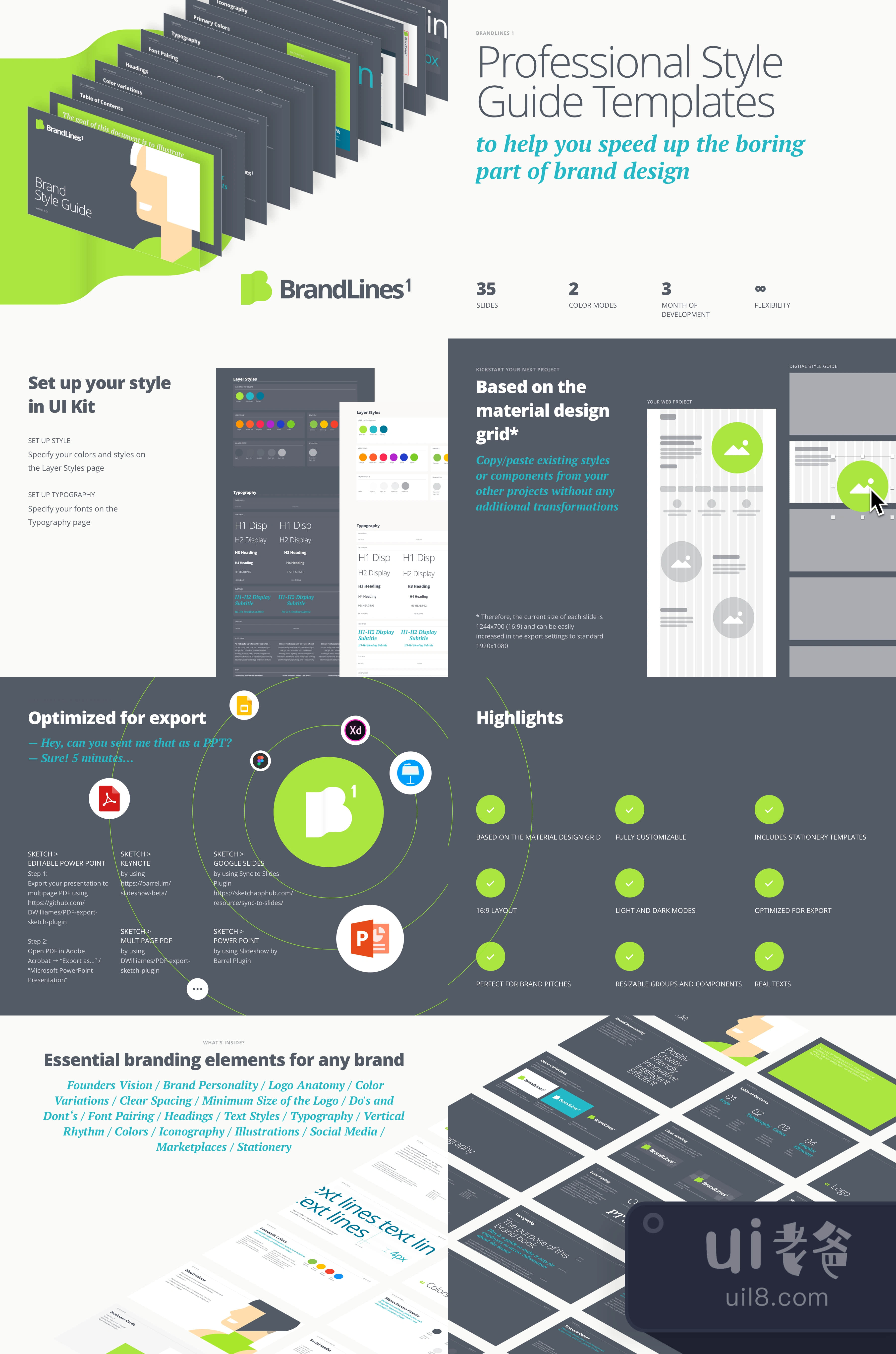 35张完全可定制且易于使用的幻灯片,涵盖了任何品牌的基本品牌元素。