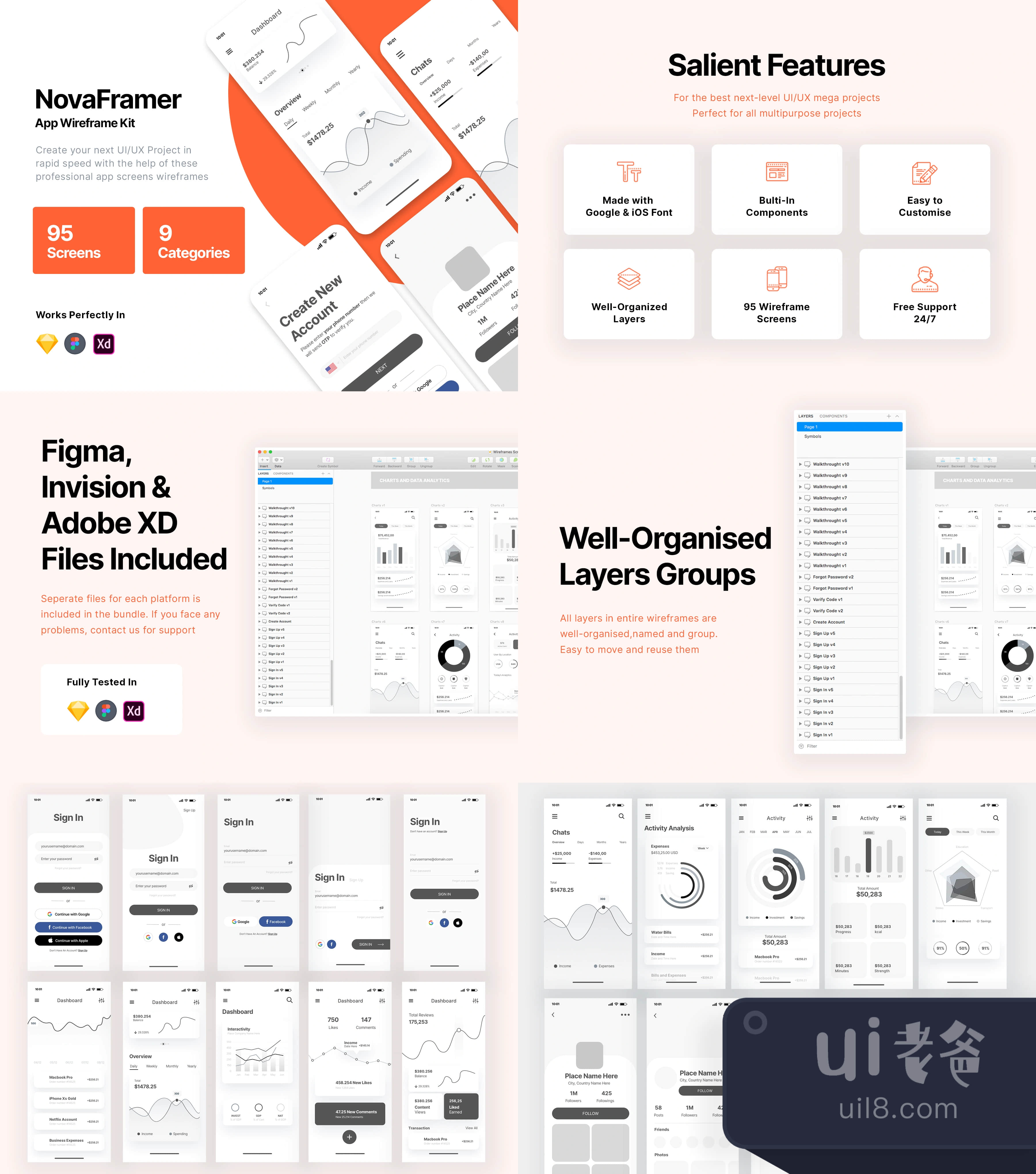 新星应用程序 - 多用途的95应用程序线框屏幕