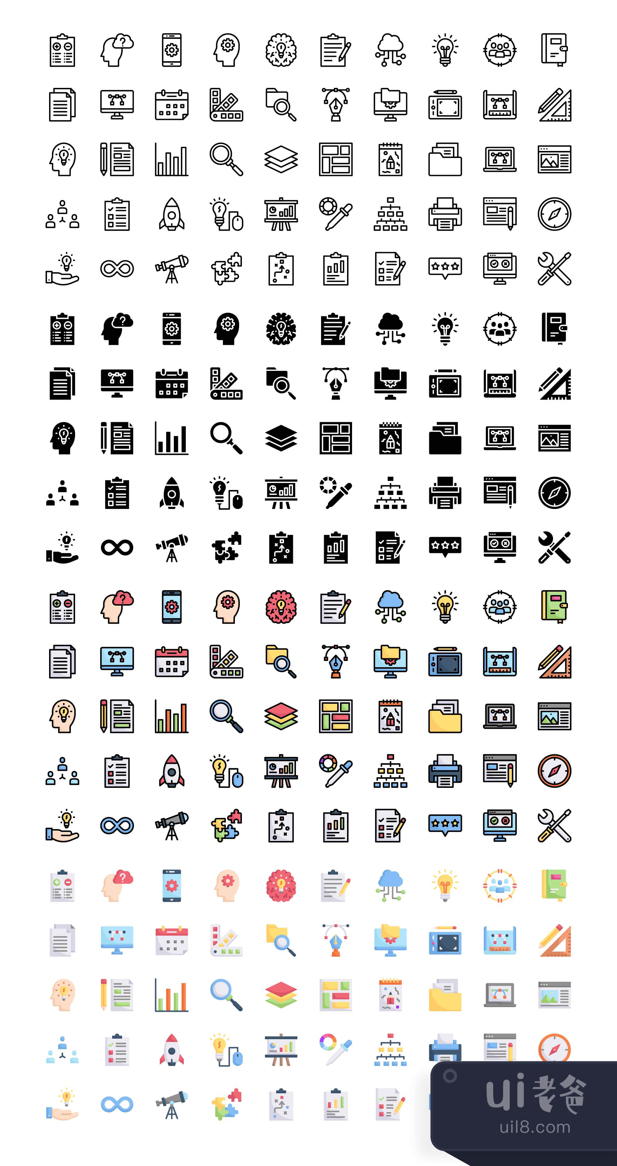 In this pack includes icons of Agenda, Analytic, Blueprint, Brain Idea, Brainstorming, Bulb Idea, Clipboard Writing, Cloud Computing, Color picker, Copy Writing, Design digital, Discover, Document, Eternity, Feedback, File and folder, Graph chart, Image website, Imagination, Inspiration, Layer, Layout, Mouse with bulb, Observation, Pantone, Pen tablet, Pencil ruler, Planning workflow, Presentation, Printer, Project, Pros and Cons,, Puzzle, Research, Schedule, Search data, Setting data Computer, Setting mobile, Sketchbook, Software computer, Startup, Strategy, Survey, Target audience, Teamwork, Testing, Thinking, Tools, Vector, Writing concept.