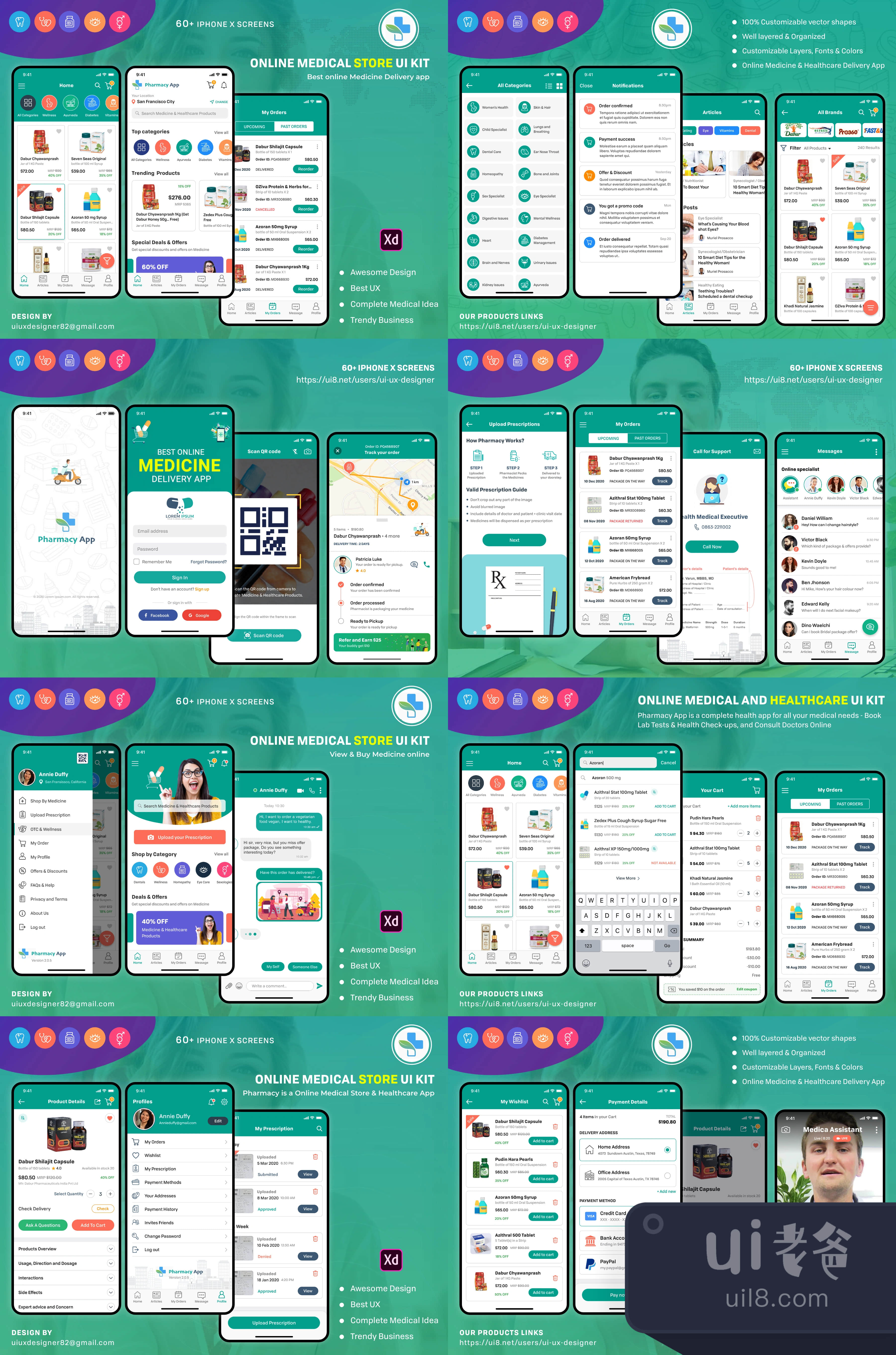 医疗药店是一个干净的iOS移动UI工具包,非常适合在线医疗药店和药品配送应用程序,包括60多个高品质的iOS屏幕模板,用Adobe XD设计。这个现代设计模板很容易定制,使你更容易设计你的下一个App。每个屏幕都是完全可定制的,并且在符号上有很好的组织,这完全可以用于编码。