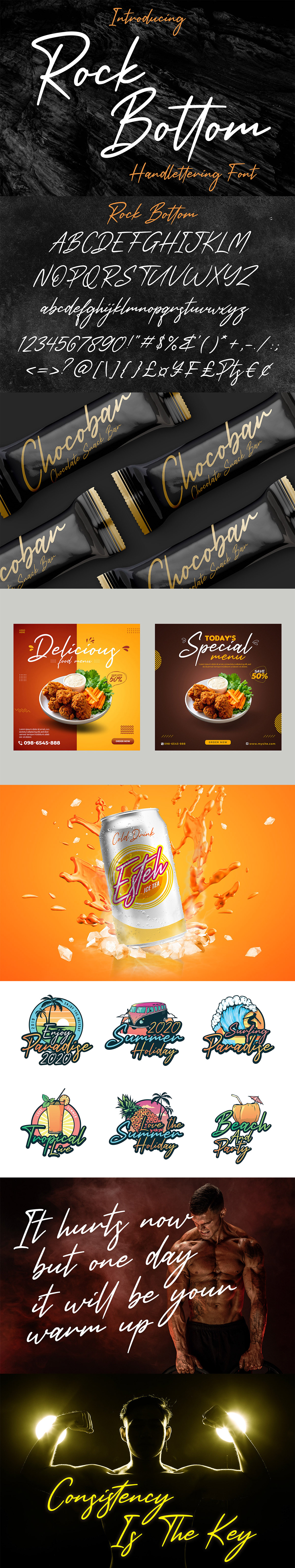 Rock Bottom Handwritten Font by Abas Creative (https://www.behance.net/abascreative)是一种流动的手写字体,被描述为一种优雅的触摸,非常适合你喜欢的项目,爱上它令人难以置信的独特和永恒的风格,并使用它来创建壮观的设计!它包含大写字母、小写字母、符号和连字符。它包含大写字母、小写字母、数字、标点符号、符号和连接词。Rock Bottom字体非常适合品牌项目、标志、婚礼设计、社交媒体帖子、广告、产品包装、产品设计、标签、摄影、水印、邀请函、文具,以及任何需要手写味道的项目。