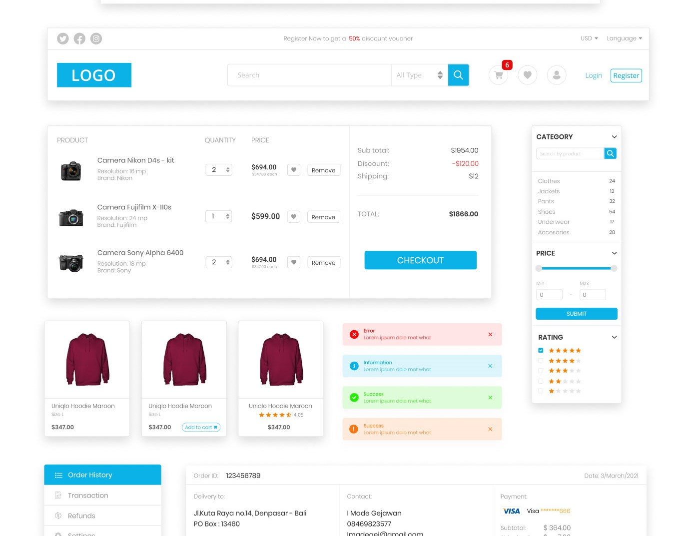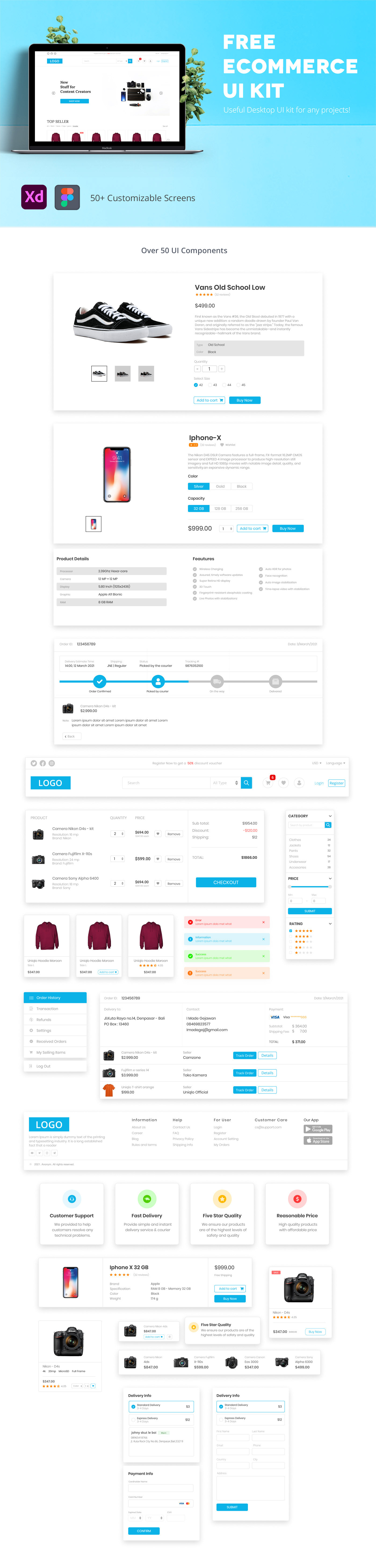 Desktop Ecommerce UI Kit by Alexander Rian (https://www.behance.net/alxrin) is a fresh and modern high-quality UI Kit with a trendy design that you can easily customize the screens, allowing for great flexibility and ease-of-use when it comes to putting the finishing touch on your project. This item has been made with user customization in mind: every screen, UI element, or component is easily editable.