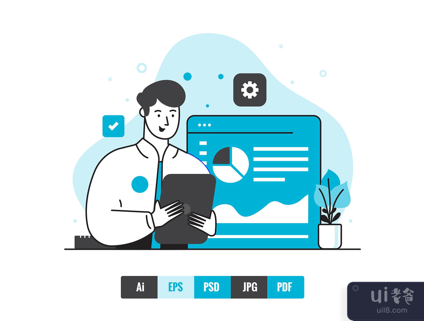 商业和营销插图集。一组有男人和女人参加商业活动的商业场景。