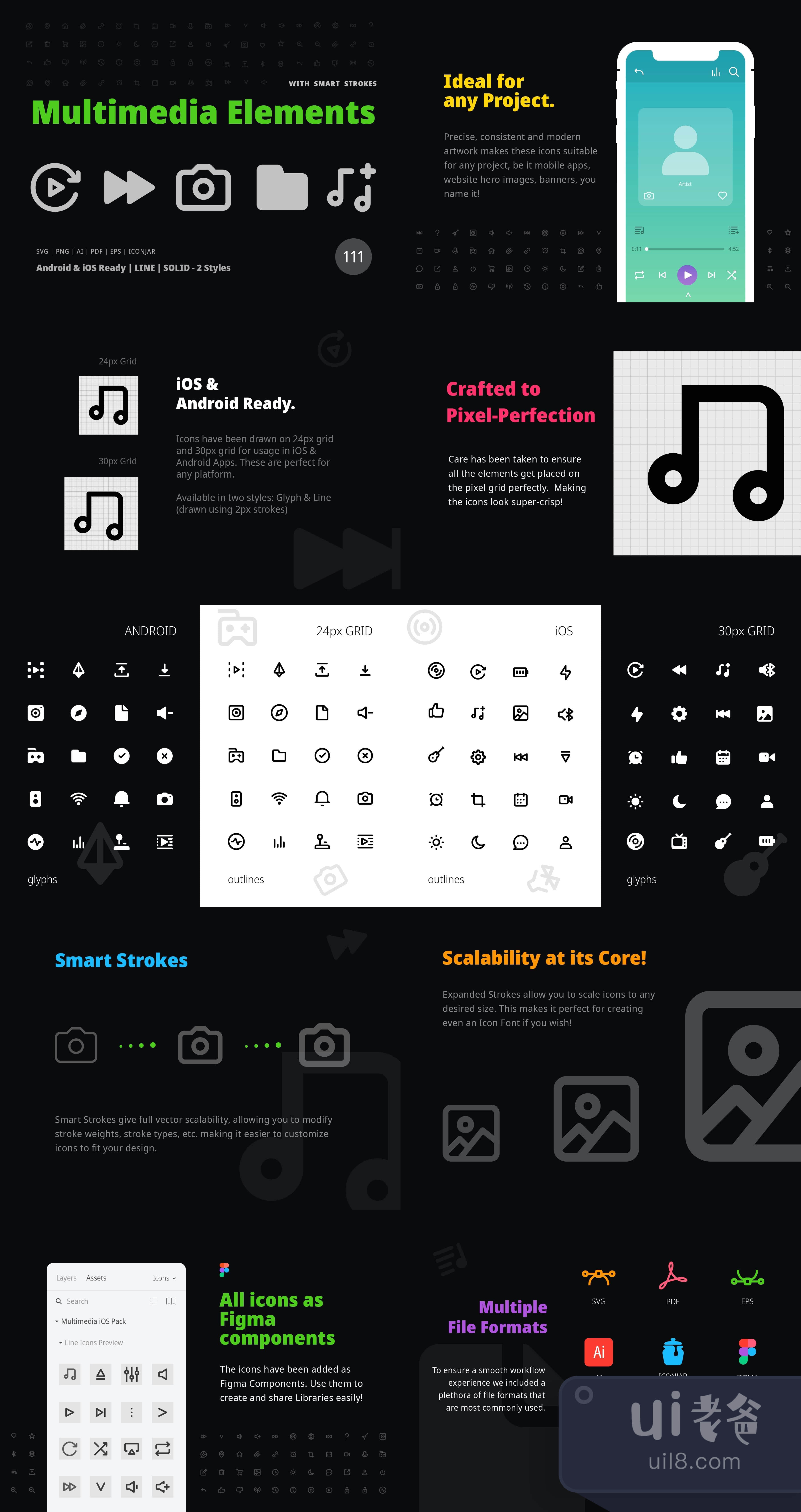 24px的网格使其成为安卓系统的理想选择,而30px的网格则适合于iOS界面! 轮廓的绘制采用了2px的笔触。图标的制作更接近于像素级的精度。除了移动界面外,它们还可以在任何平台上选择使用。希望你喜欢它们! :)