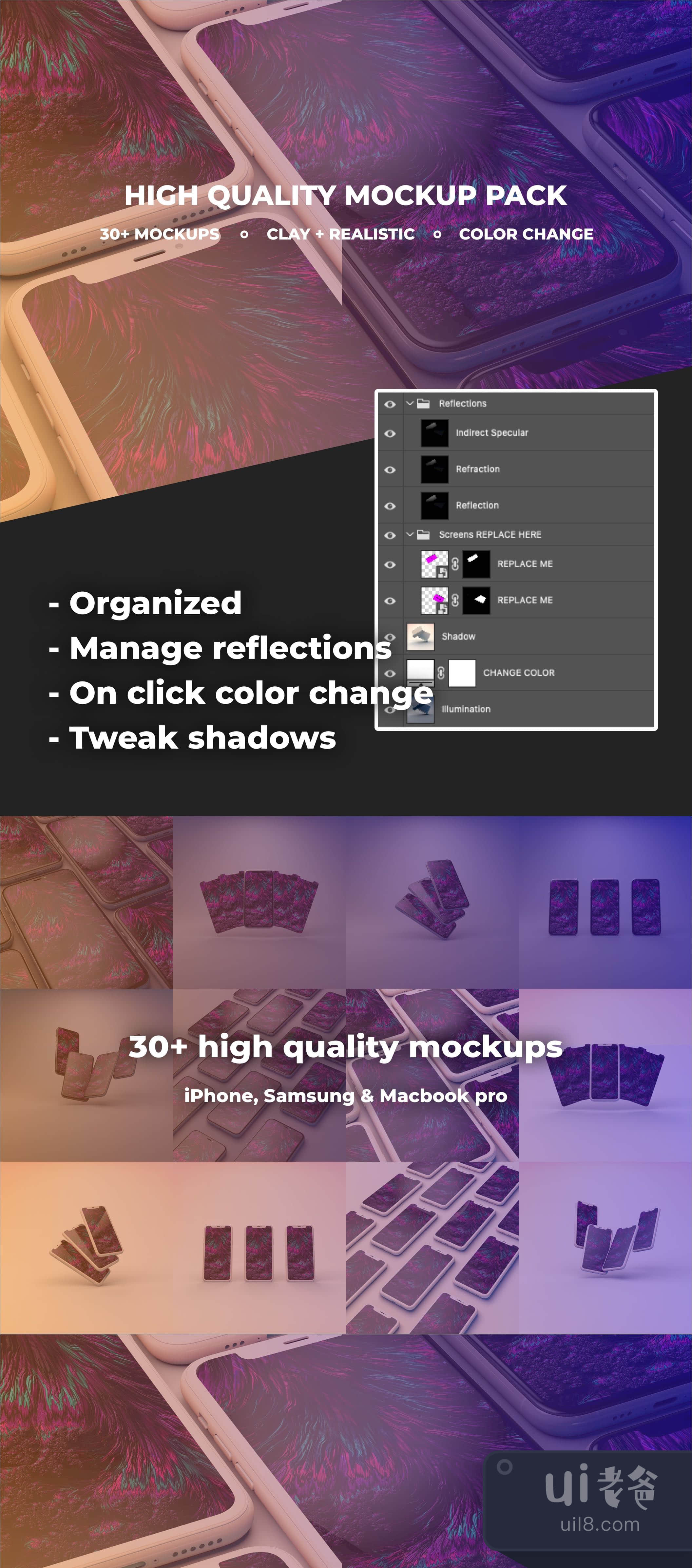 用于Photoshop的高质量模拟图。用C4D和Photoshop制作。轻松地用动态对象交换屏幕。