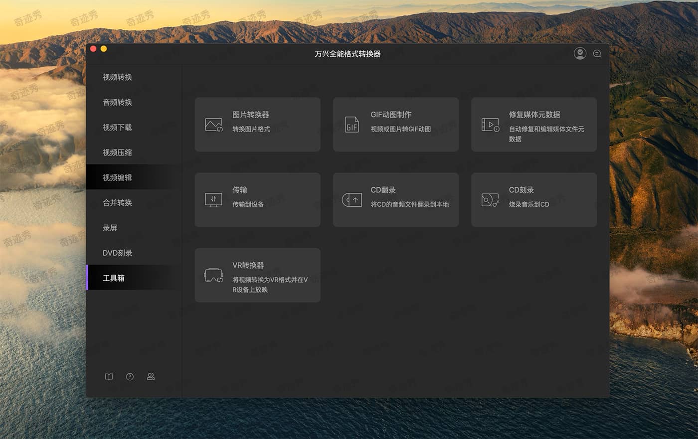 还有一个强大的工具箱,里面包含:图片格式转换器、视频/图片转GIF、编辑修复媒体Meta元数据、无损压缩视频、视频转VR格式、CD烧录器、IOS/DVD光盘复制、CD翻录、屏幕录像、投放视频到电视。功能非常强大,是一款必备软件。