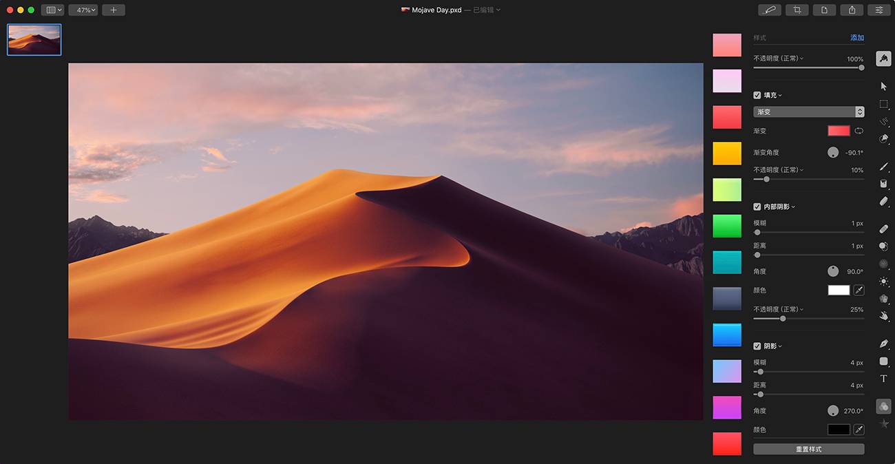 相对于Adobe Photoshop来说Pixelmator是一款轻量级修图软件,干净整洁的界面易于操作,界面清爽,布局灵活,熟悉 Photoshop 的人可迅速上手。软件建立在一些开源和 Mac OS X 图形技术之上,可调用 Mac 图形加速。使用起来在界面交互和流畅感上均优于 Photoshop,且与 Mac 自带程序整合不错。