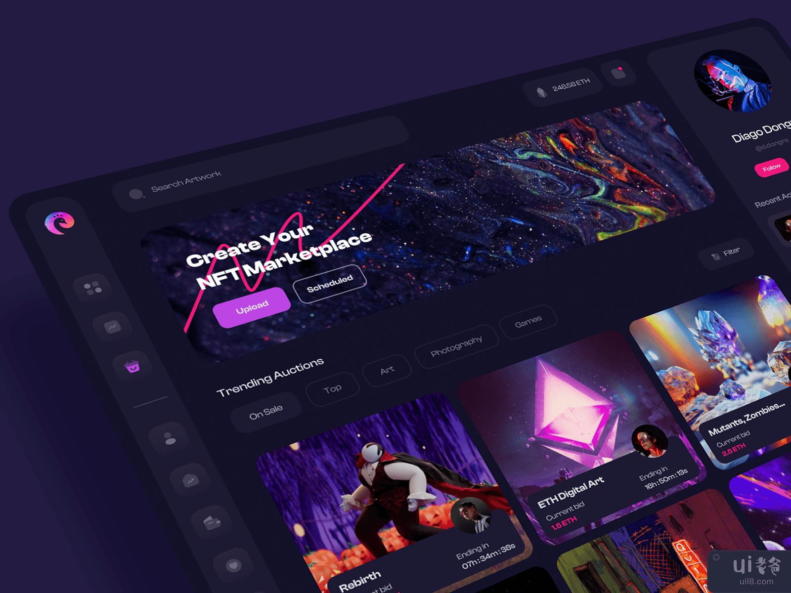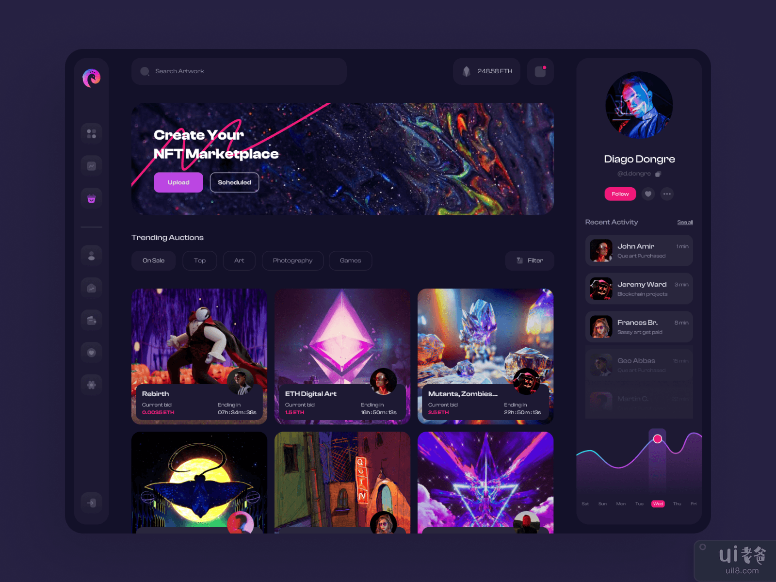 您好,创意人员!希望您一切顺利。这是一个 NFT 市场仪表板概念。让我知道您对设计的想法,不要忘记按“L”按钮😎