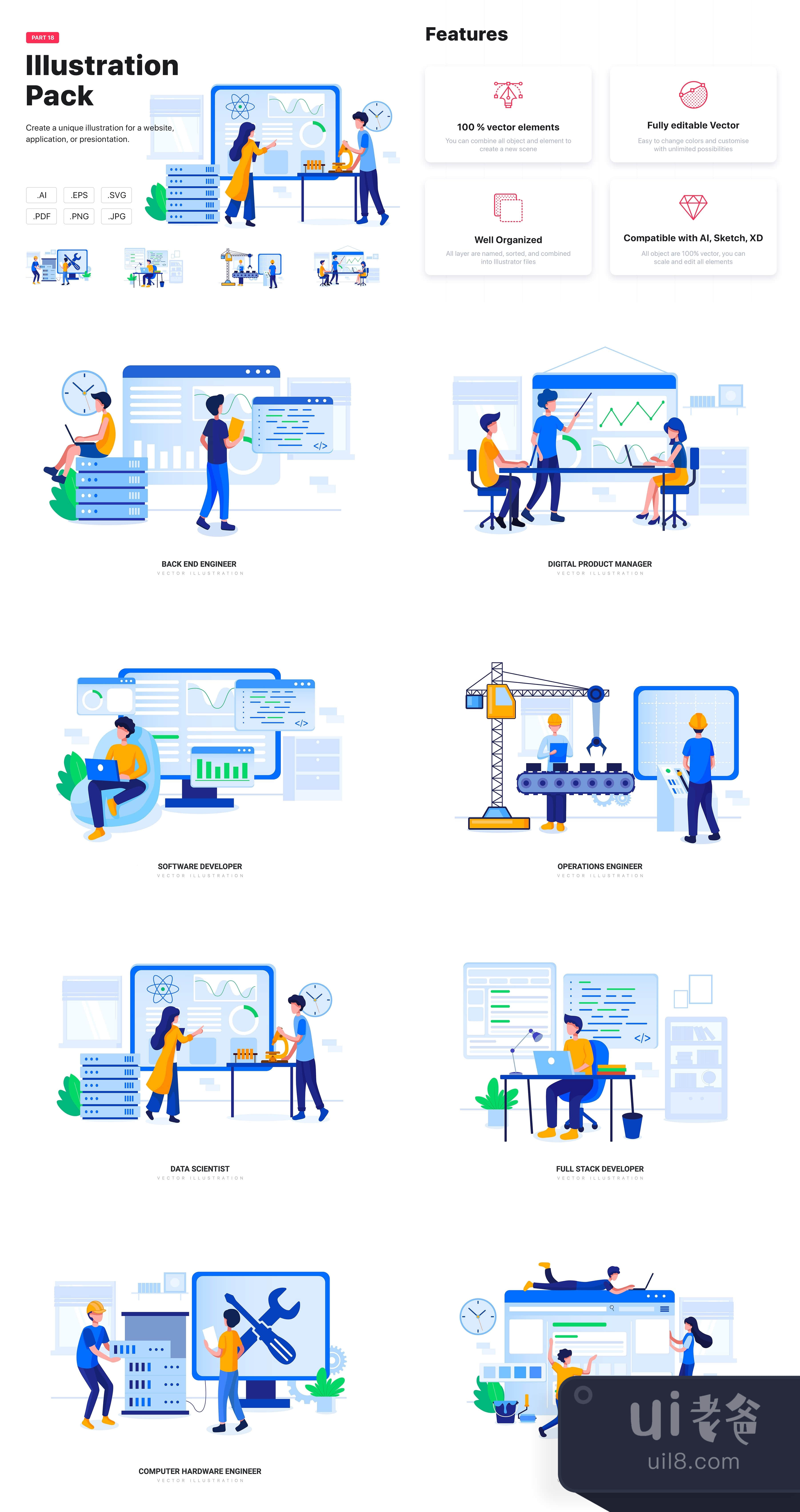 为网站、应用程序或演示文稿创作独特的插图。这个插图包确实有助于您的数字需求。你可以把这幅插图用于你的网站,特别是标题部分。