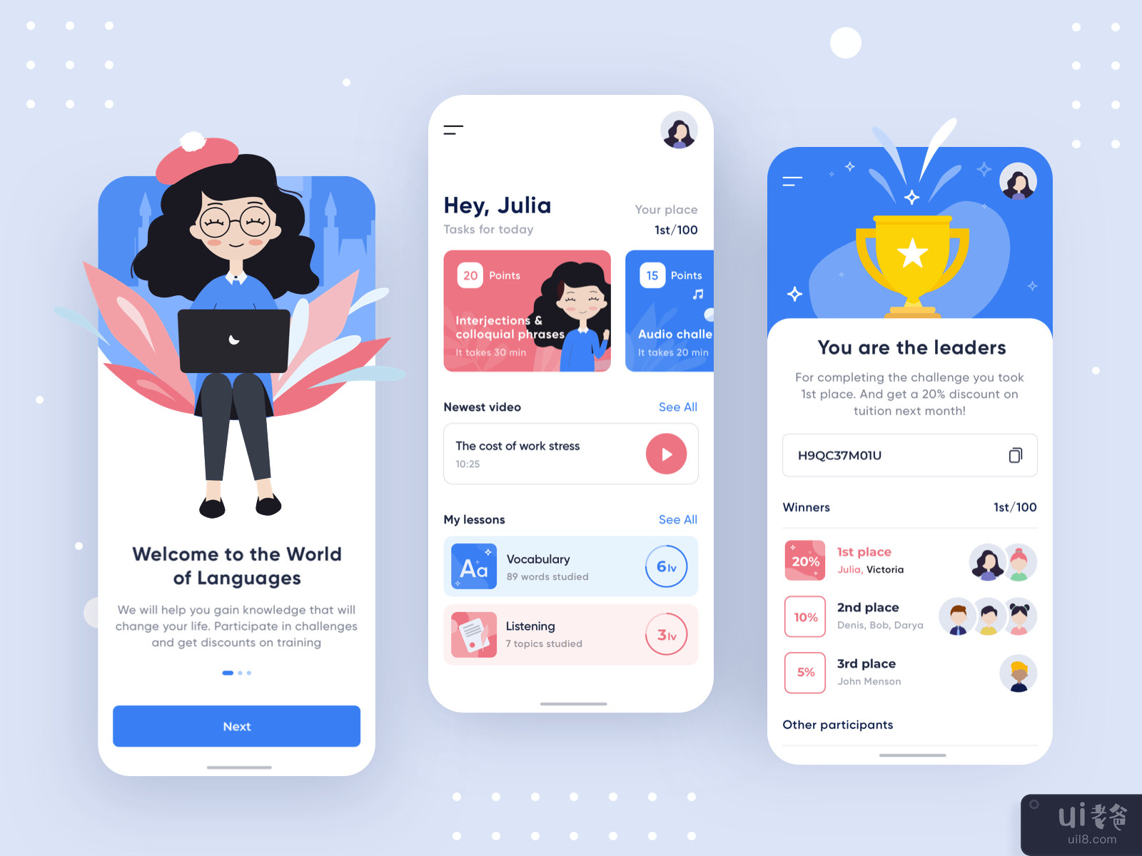 Hi everyone!I wanna introduce you the concept of a foreign language learning app. Daily competitions contribute to increasing the attendance of the application. Participate and win in challenges and get discounts on paid lessons.