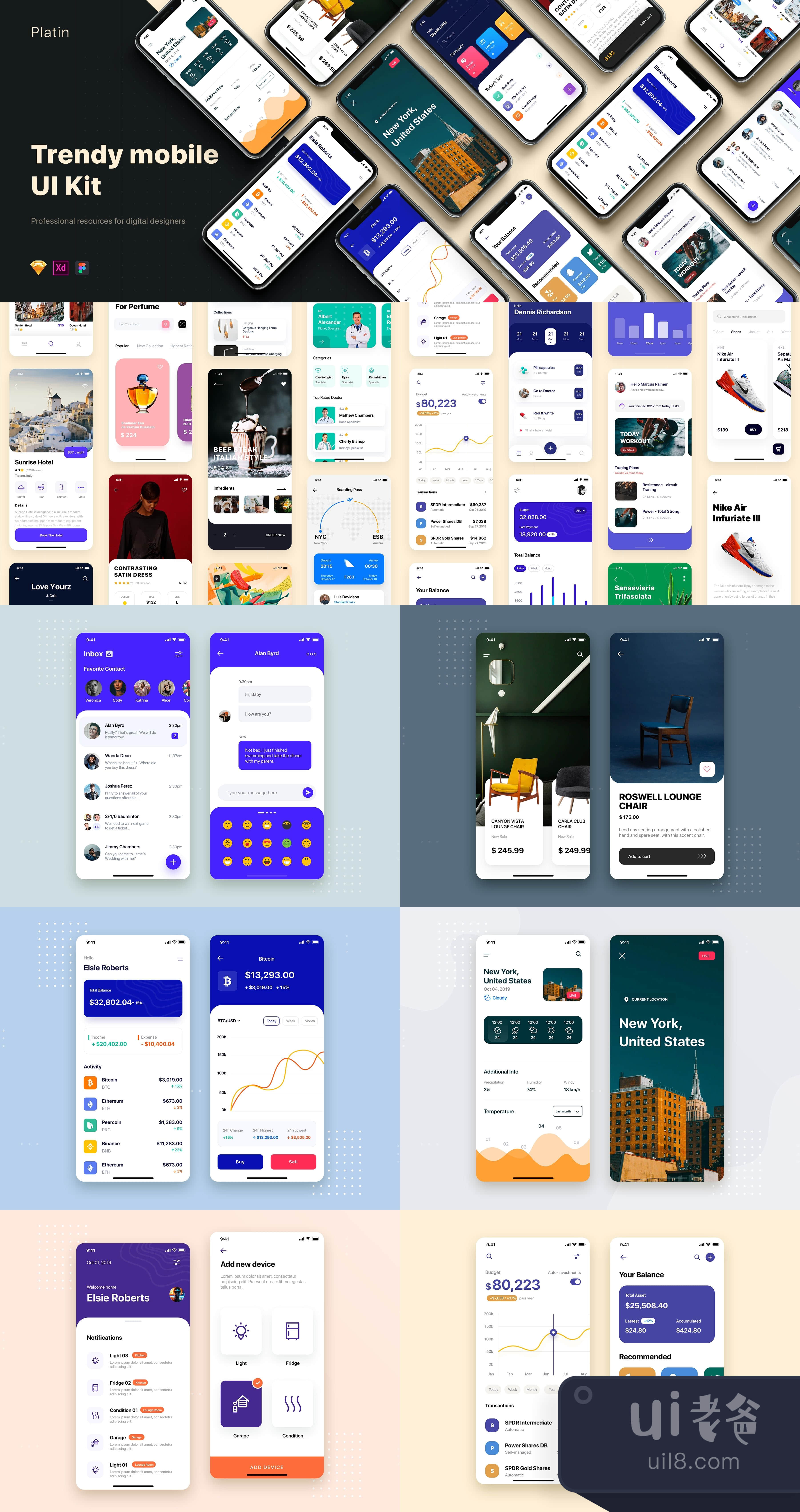 Platin mobile UI Kit is a huge mobile screens and components with trendy design that you can use for inspiration for your app with super quality design. The kit includes 60+ UI mobile screens based and 20+ most popular categories.