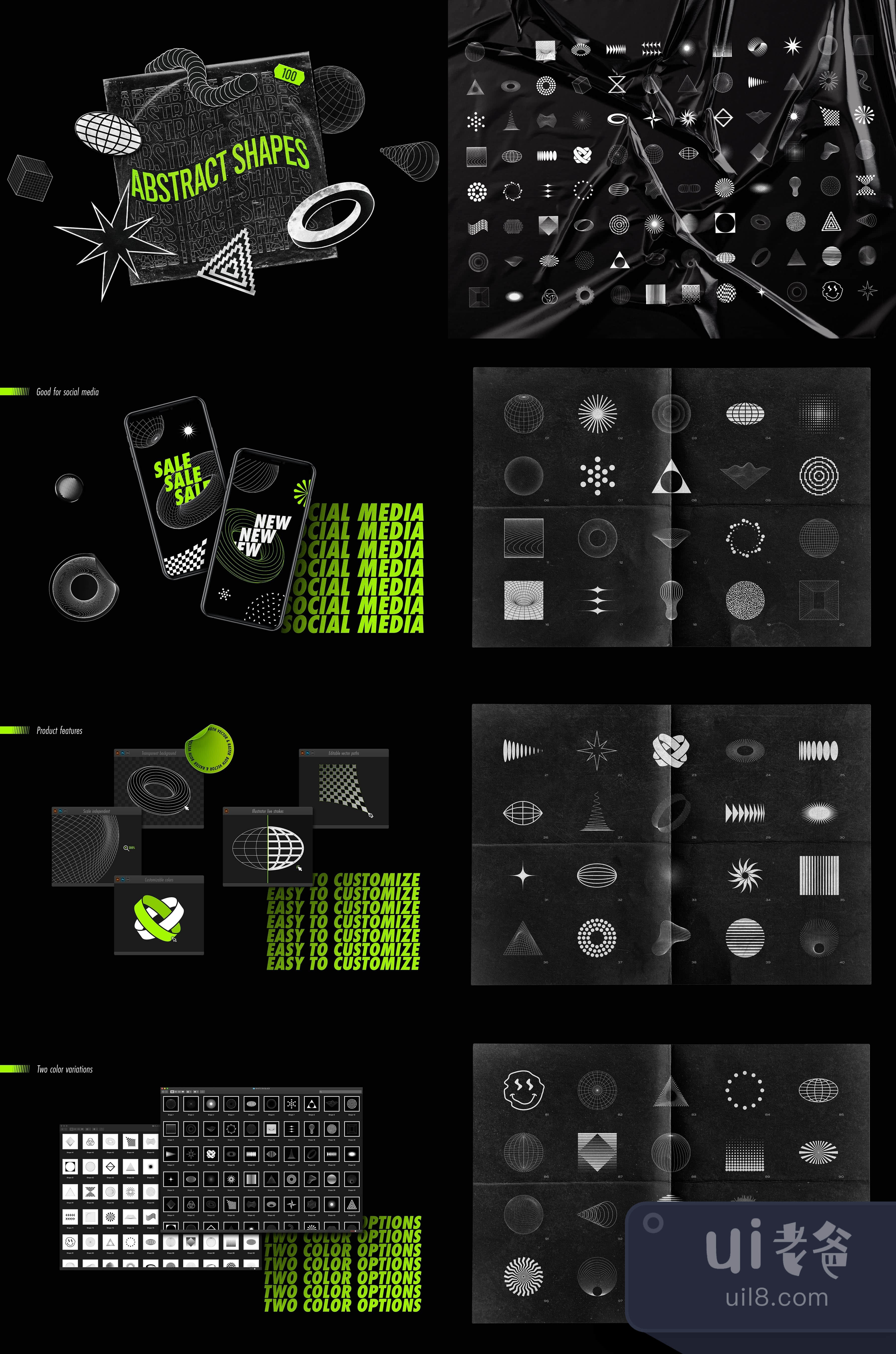 无论你是在做:与众不同的视觉识别系统;醒目的海报设计;令人难忘的标志标记;时尚的印刷品或标志性的封面设计--抽象形状系列为你提供了大量的审美可能性,为你的项目提供活力和无限的视觉丰富性。