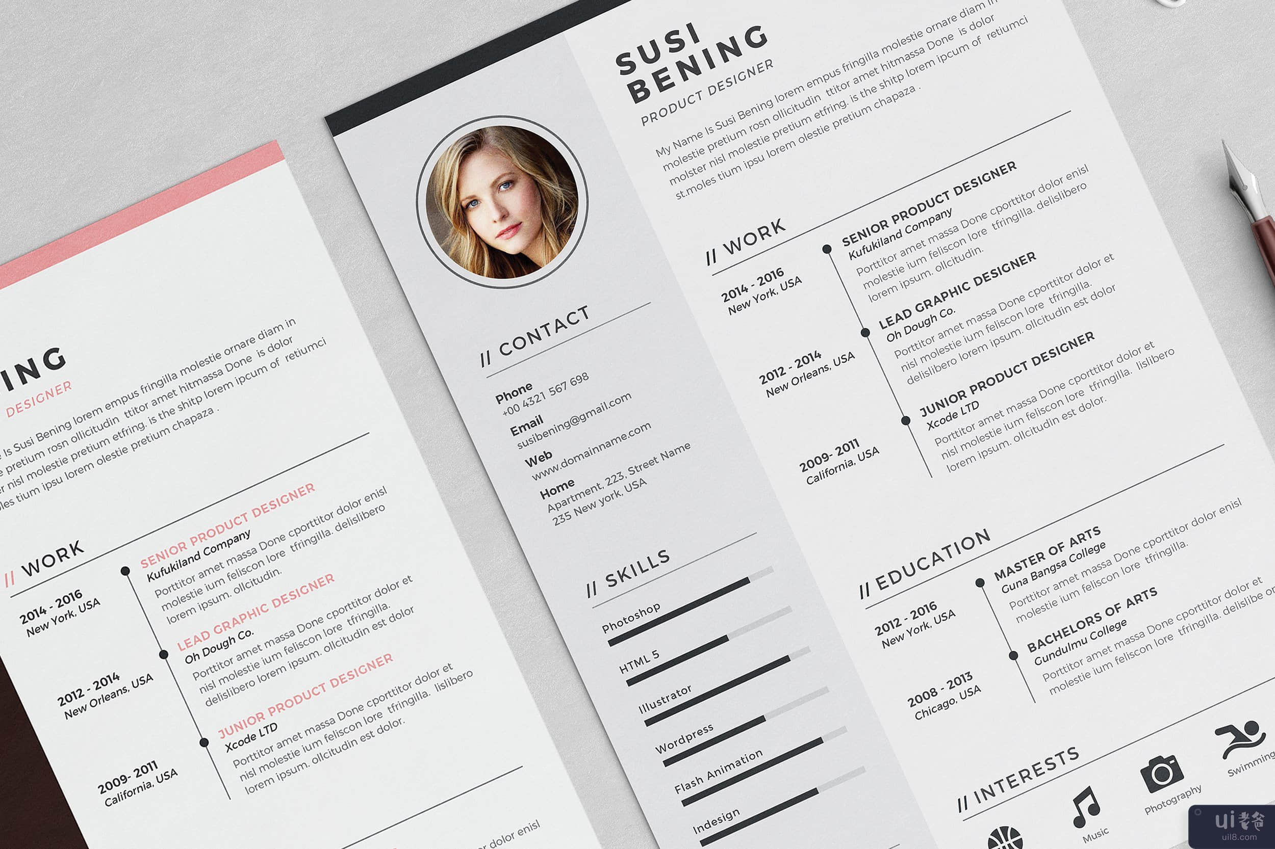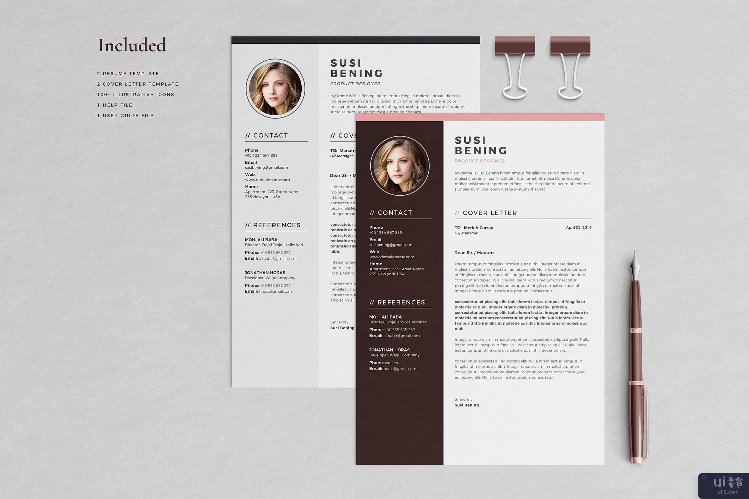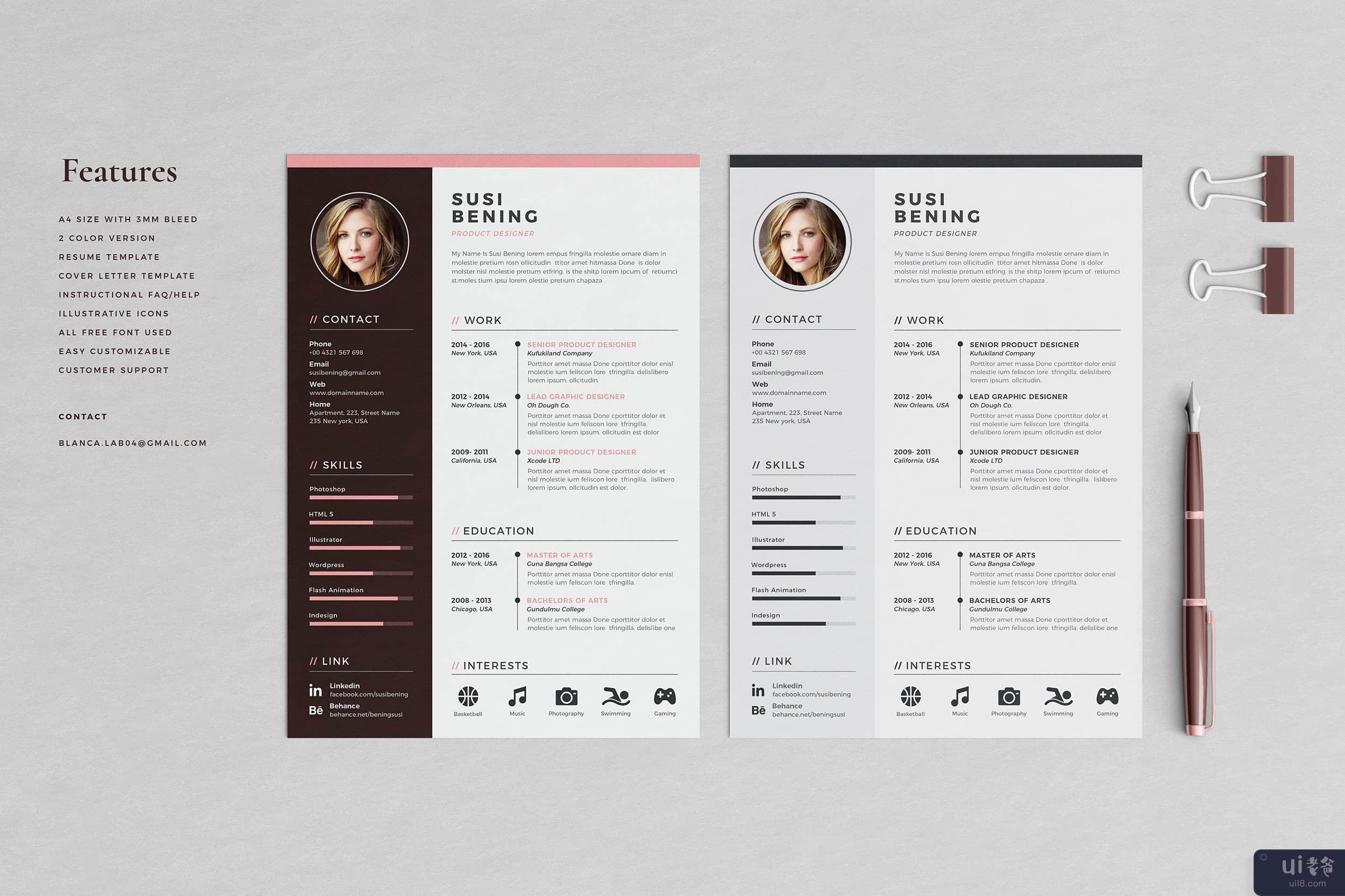 Susi Bening 简历模板 是一个专业设计的简历(CV),干净现代的简历,非常易于编辑,里面有清晰的组织和标签层。此简历的每个元素都是 100% 可编辑的,以帮助您创建专业的、美观的简历,给人留下积极的印象。产品特点: