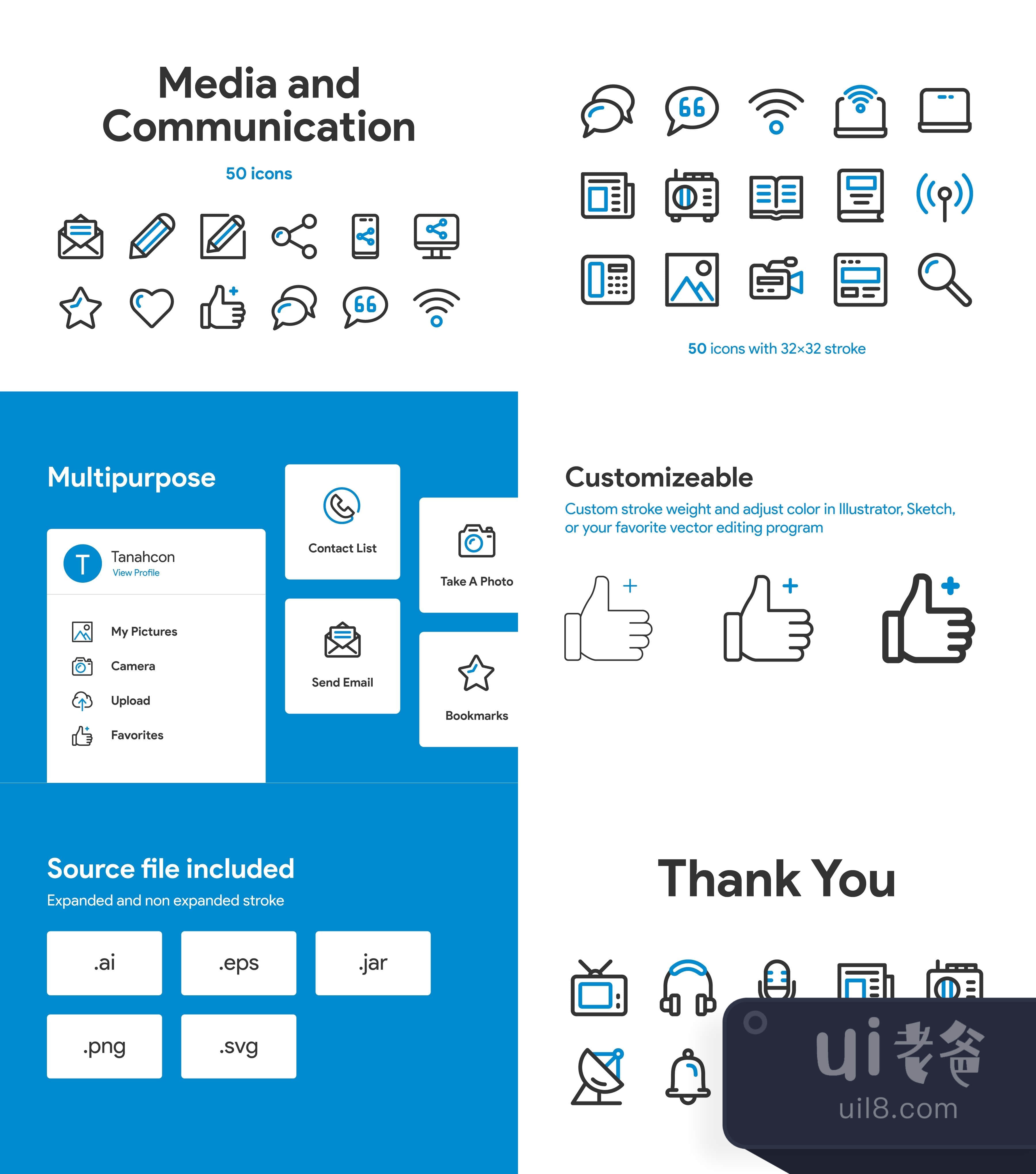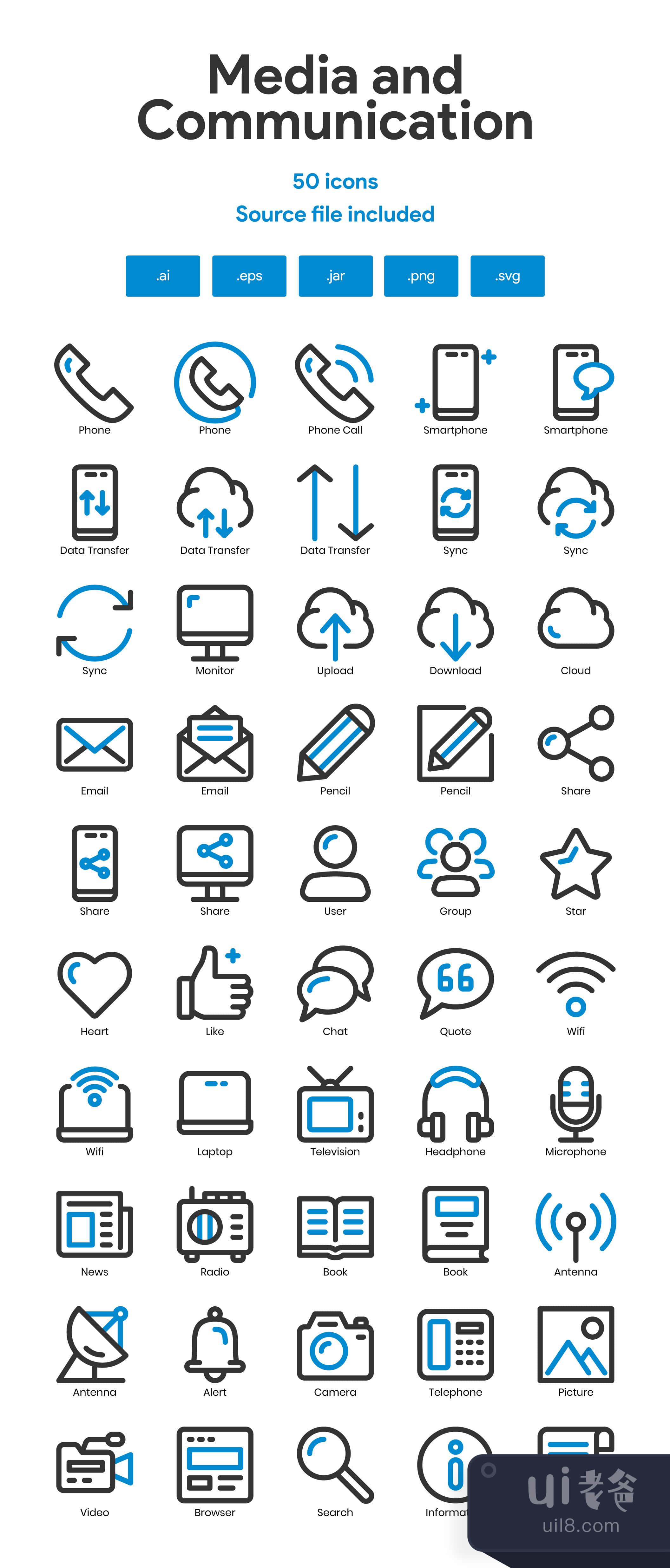媒体和通信图标集由50个图标组成,网格为32x32px。点击预览按钮可以看到所有的图标。文件包括在软件包中。.ai(已展开和未展开)、.eps、.svg、.jar、.png。喜欢,评论,并关注我们,以获得更多的更新!