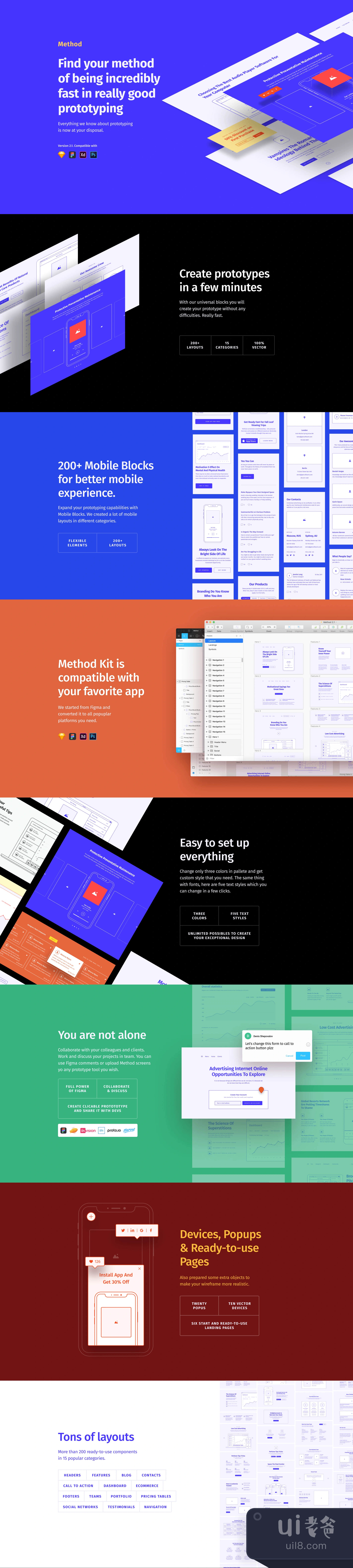 在几分钟内创建原型。使用我们的通用模块,你将毫无困难地创建你的原型。真正的快速。与你的同事和客户合作。在团队中工作和讨论你的项目。你不再需要任何其他工具了。只需改变调色板中的三种颜色,就可以得到你需要的自定义风格。字体也是如此,这里有五种文字风格,你只需点击几下就可以改变。大量的布局。在15个流行的类别中,有超过200个现成的组件。