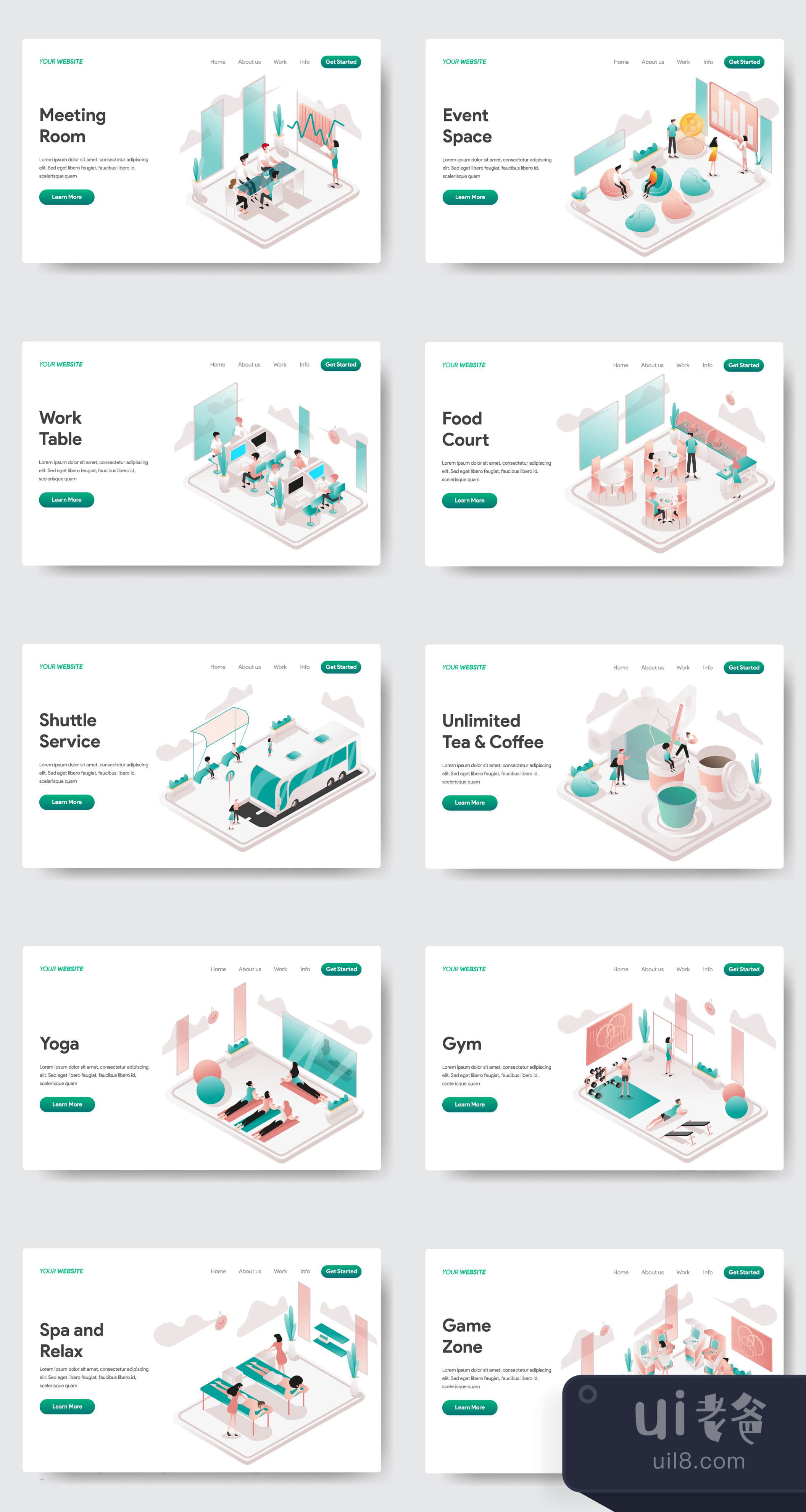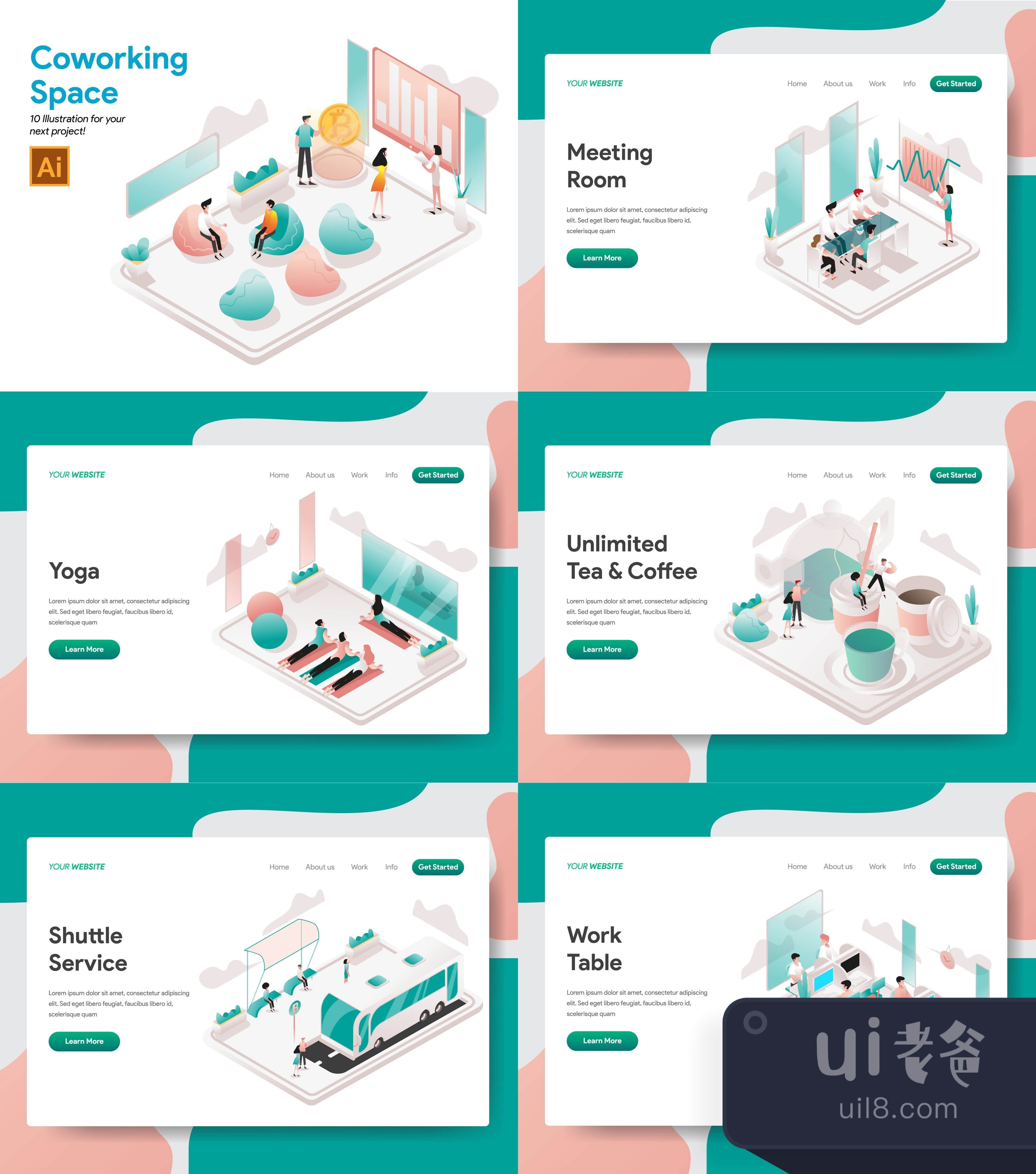 10 Illustration for Coworking Space Concept in vector EPS 10 file. Suitable for website pages, click preview button to view all 10 illustrations. Like, comment and follow to see more updates from us!