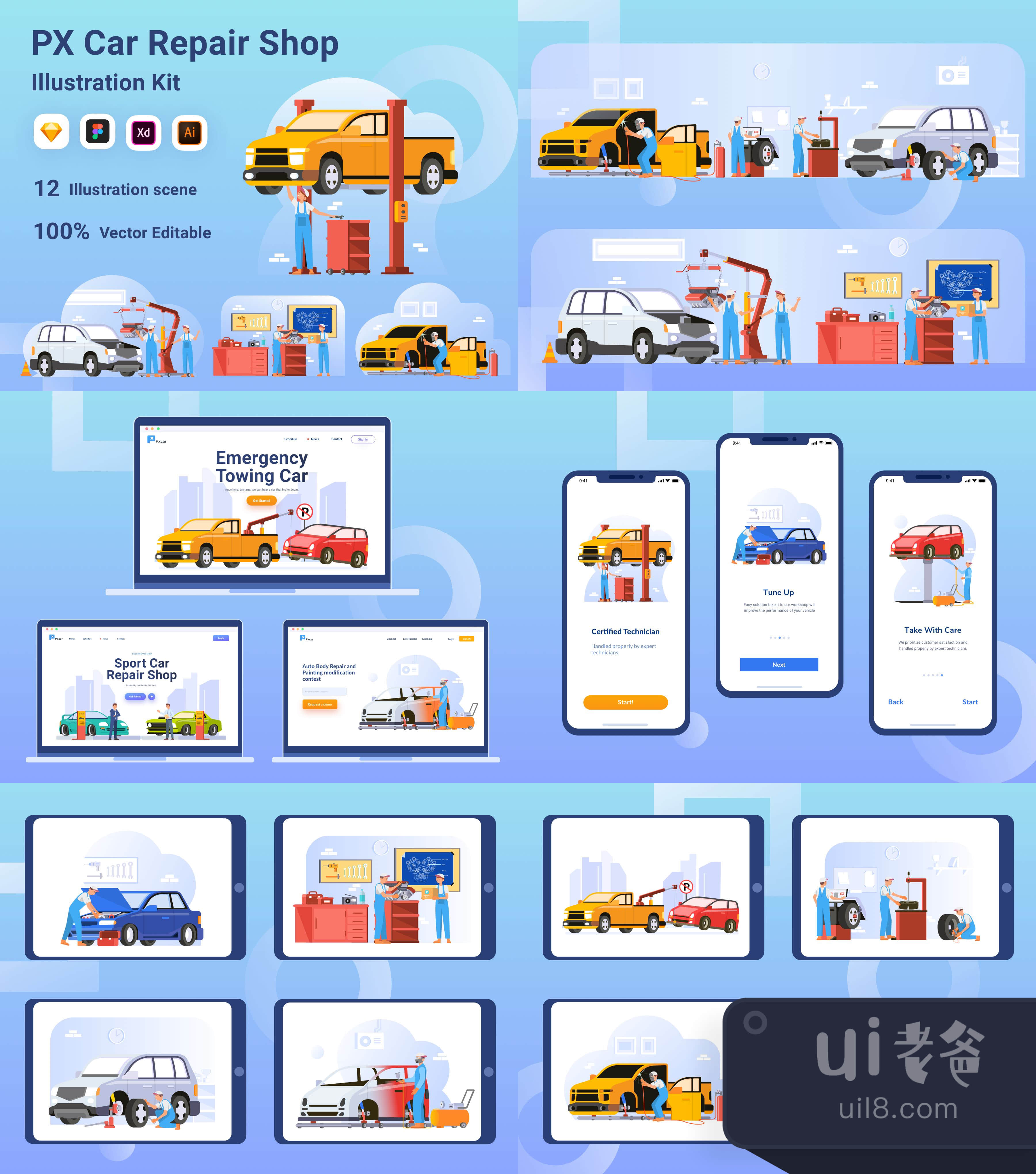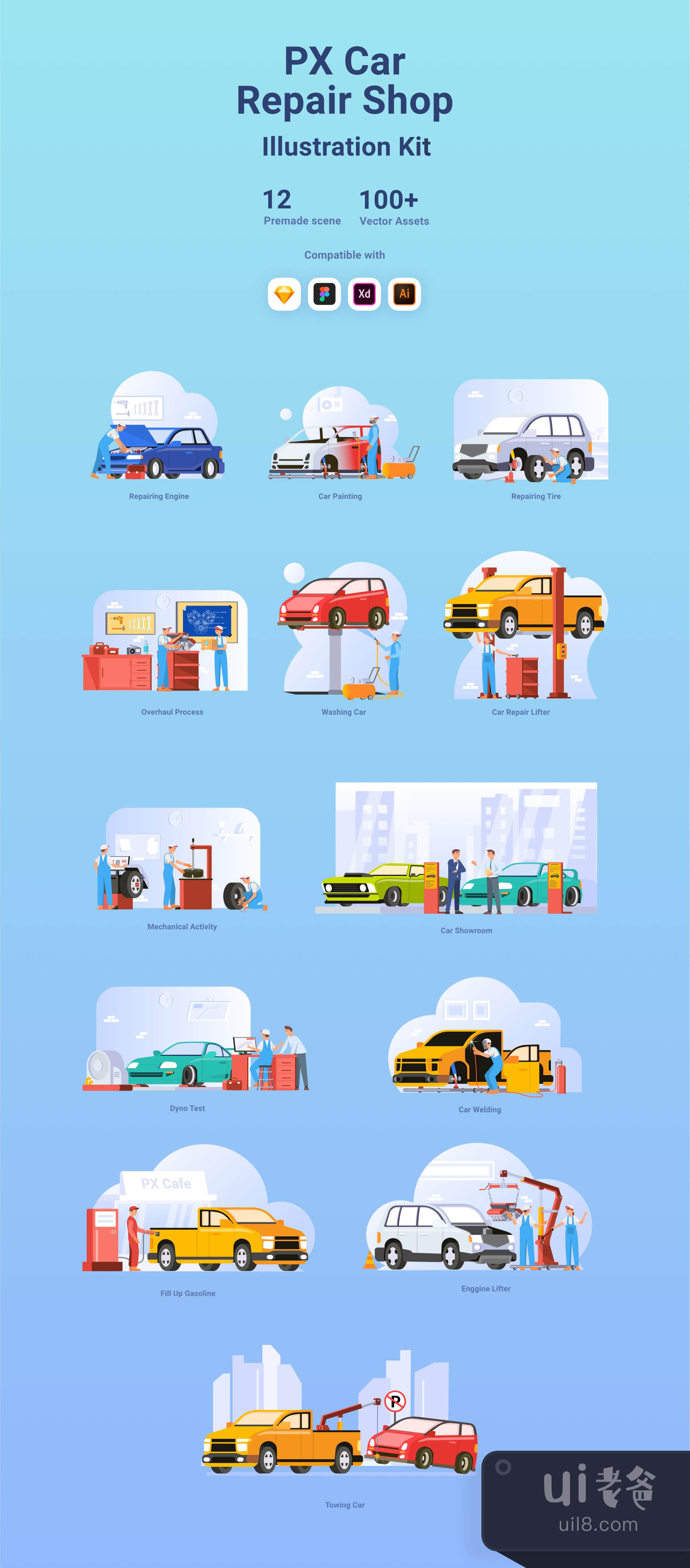 Hello, Let us introduce our new Illustration kit, it's Car Repair Shop PX! a good quality illustration kit with 100% Vector
