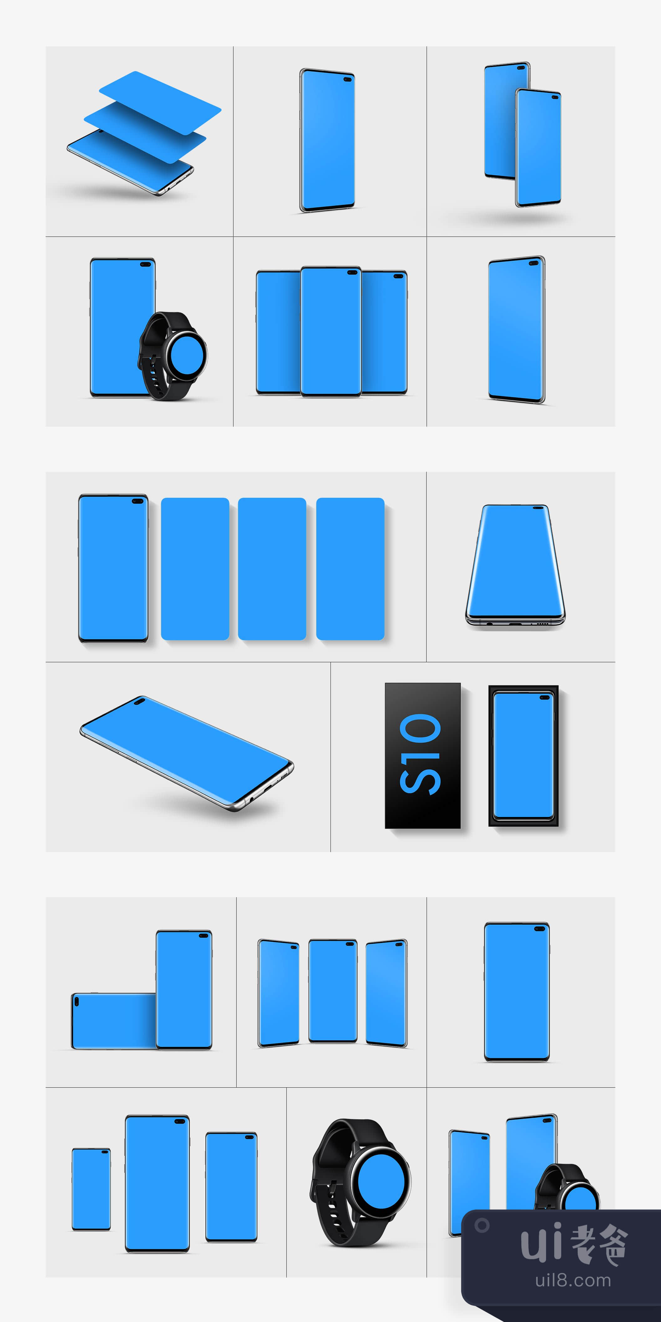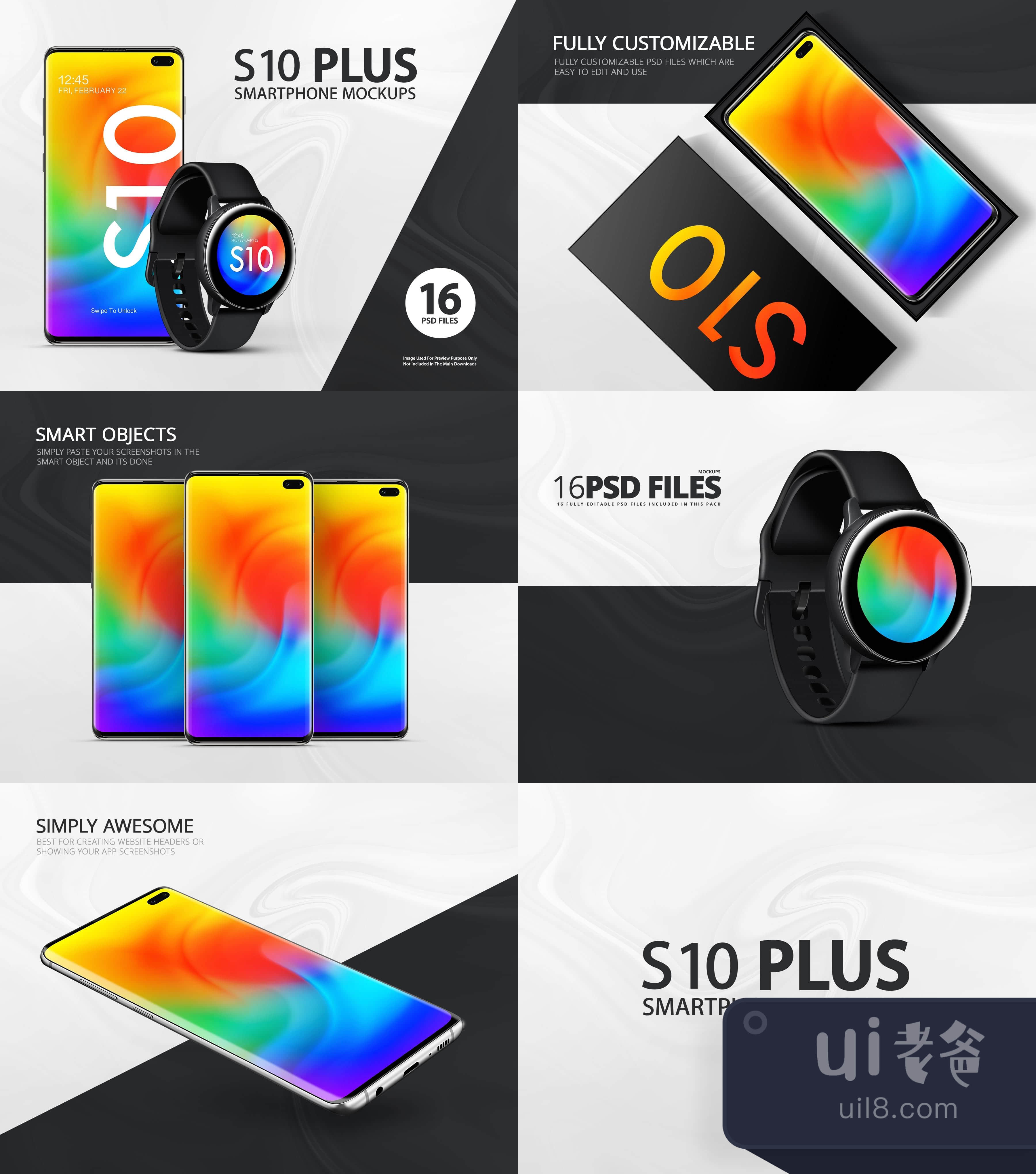 项目 - S10 Plus 智能手机模型|包包含16个高分辨率的PSD文件(如预览图所示),具有智能对象功能。