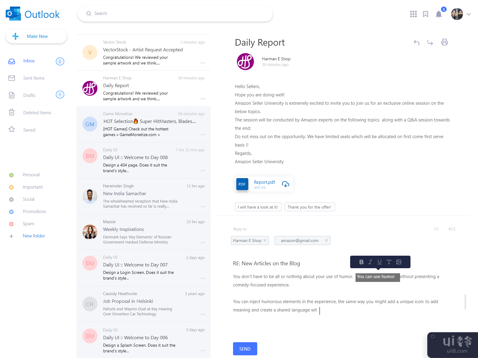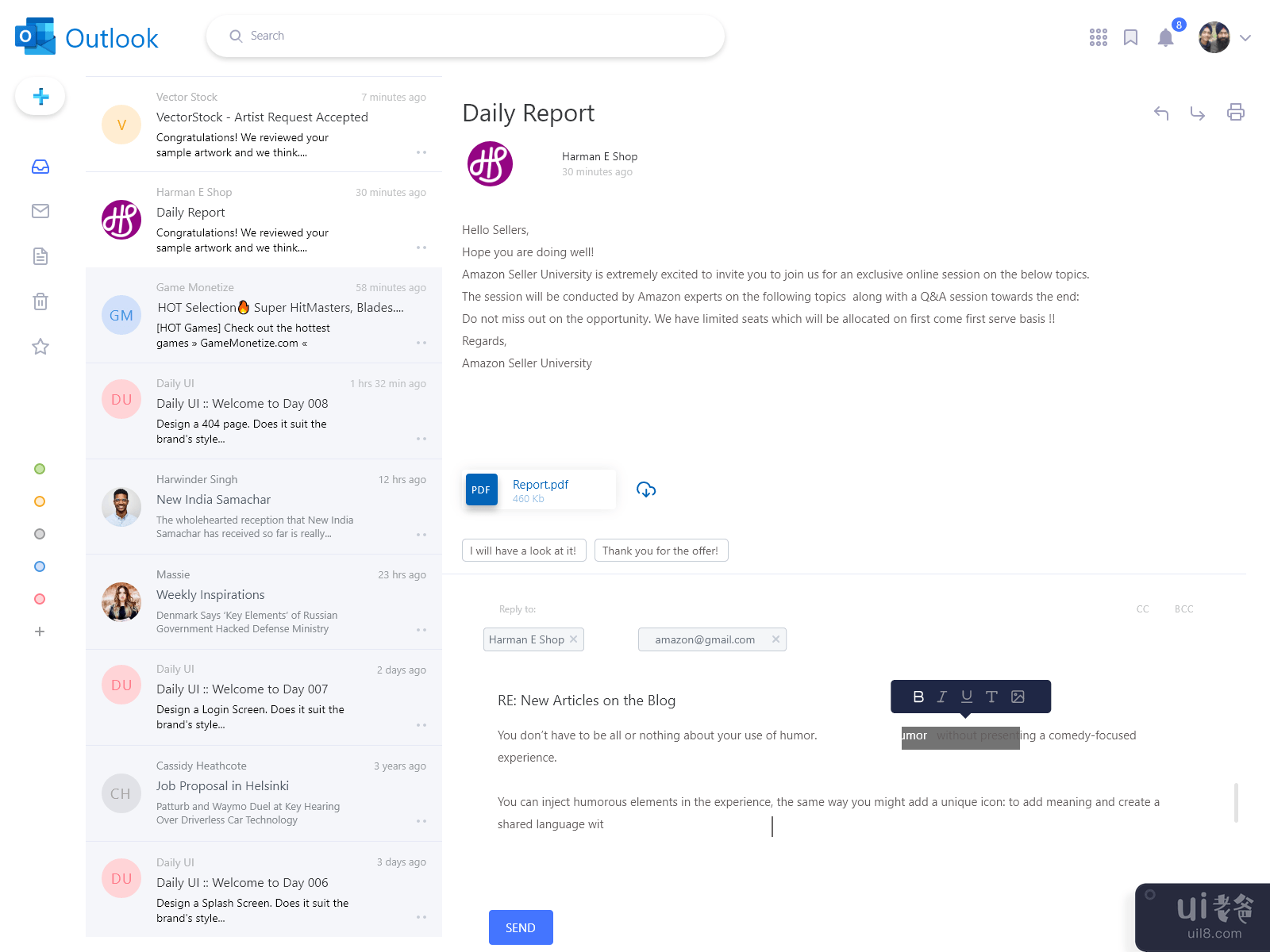 朋友们,我为 Uplabs Outlook 电子邮件重新设计制作 Outlook 电子邮件设计。请支持我们和UpVote 我的设计。