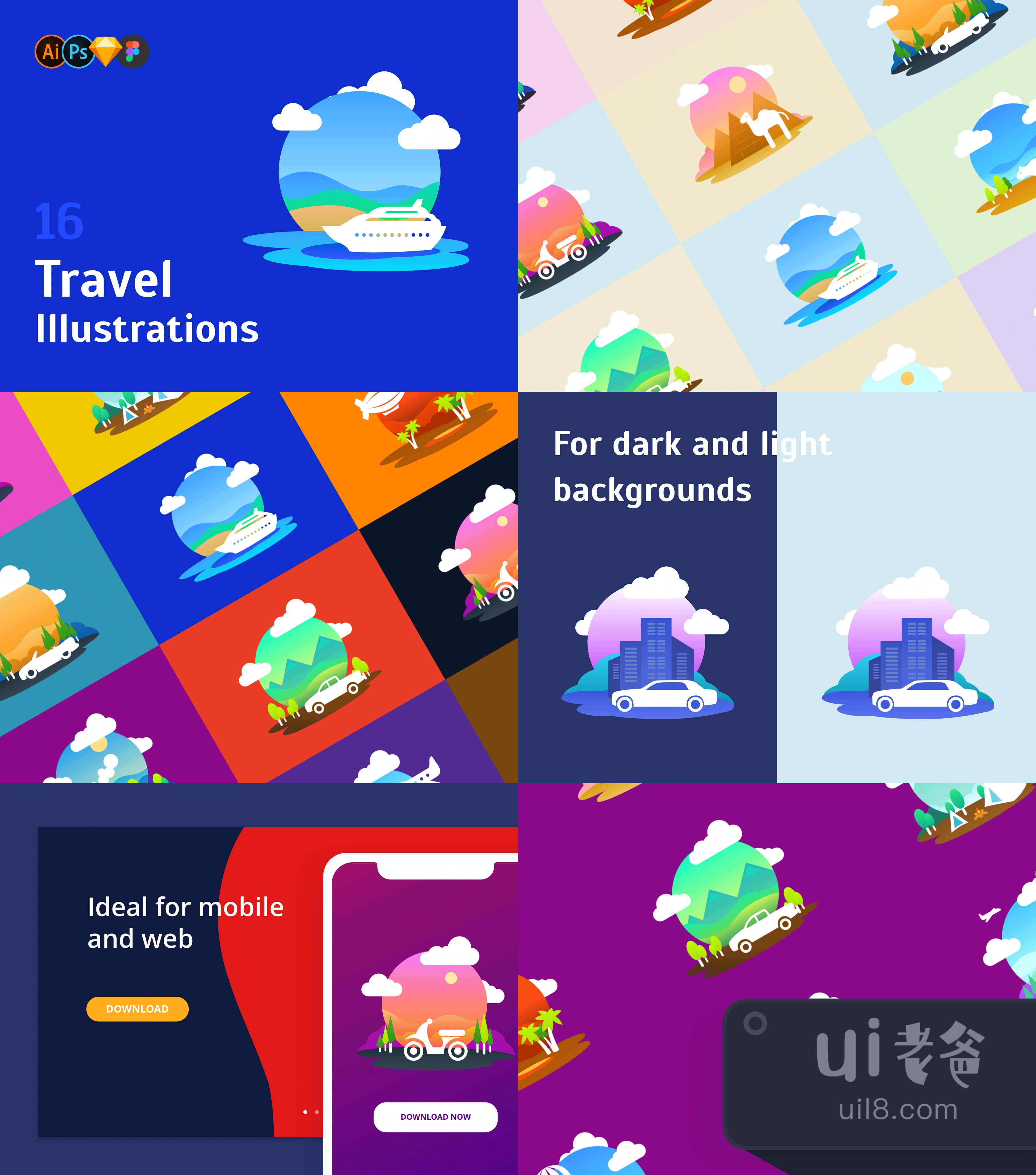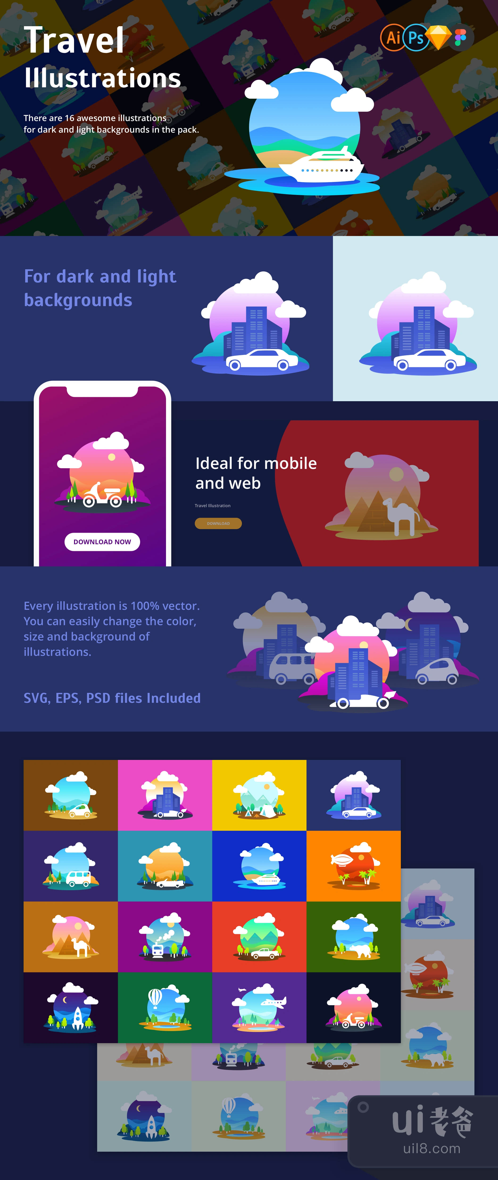 每幅插图都是100%的矢量。你可以轻松改变插图的颜色、大小和背景。