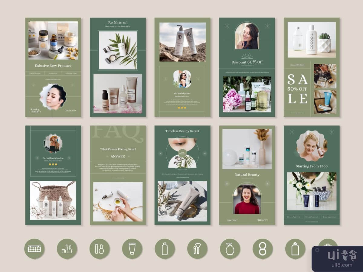 Instagram 营销模板 - 天然护肤 | Instagram 故事模板 | Instagram 帖子模板 | Canva, Photoshop, 插画 |代码:003