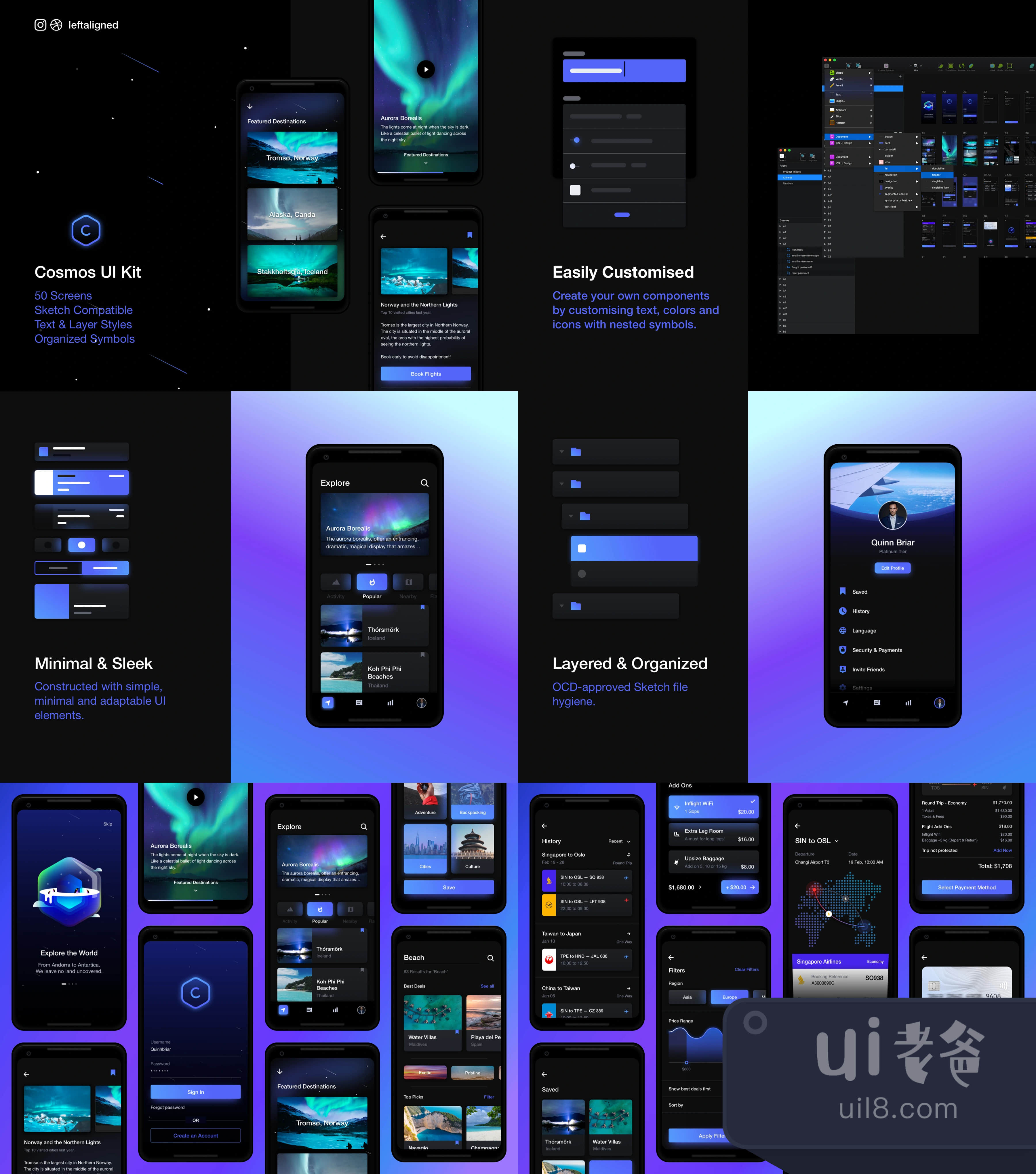 Cosmos是一个为漫游者发现地点、跟踪航班价格和购买飞机票的应用平台。精心制作的细节,视觉界面充满活力,令人叹为观止。Cosmos有一套50个屏幕和元素,可以很容易地定制,以满足您的需求。