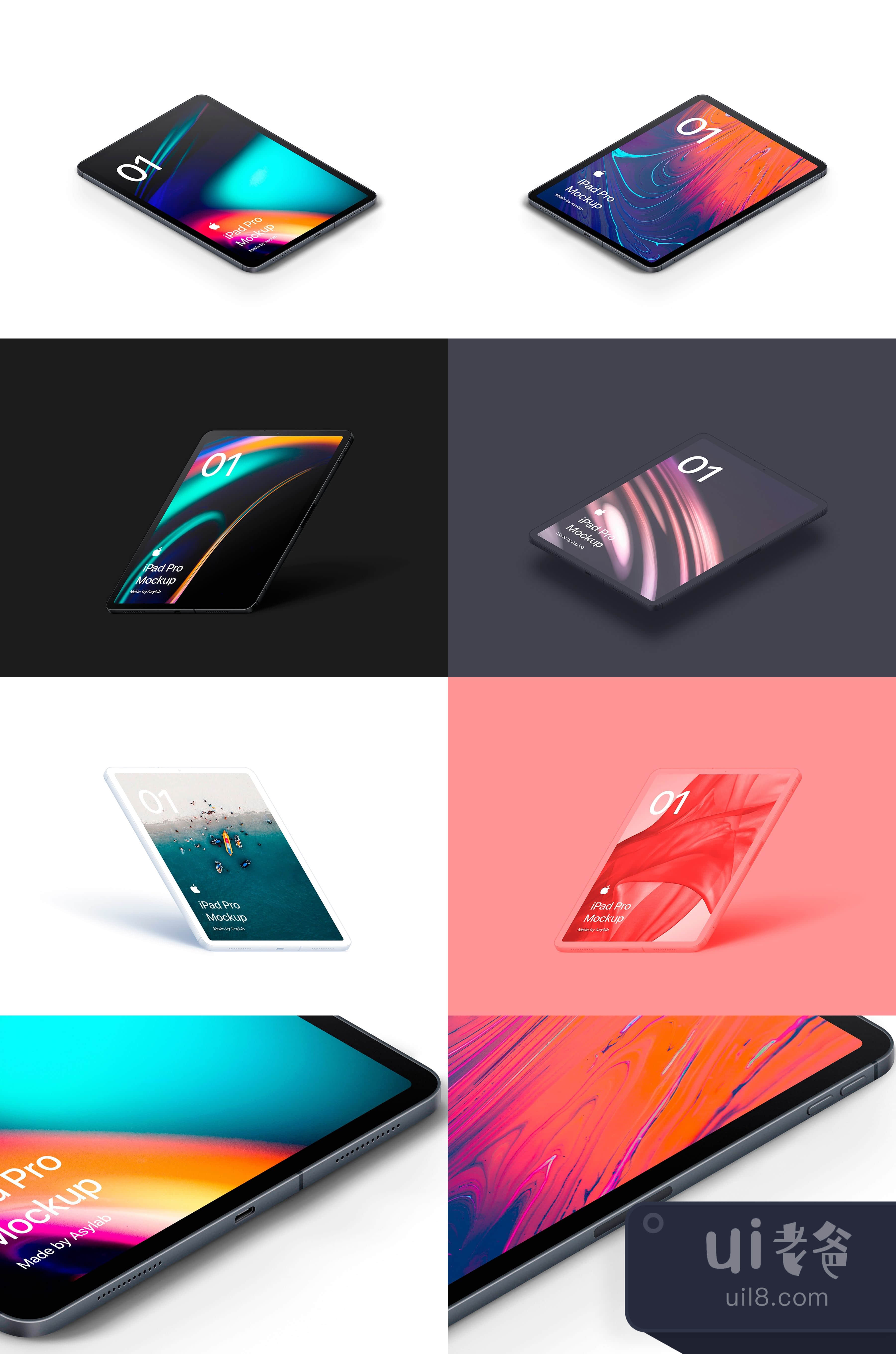 Includes 8 PSD Mockups - iPad Pro 2018 Isometric Original & Clay Version.