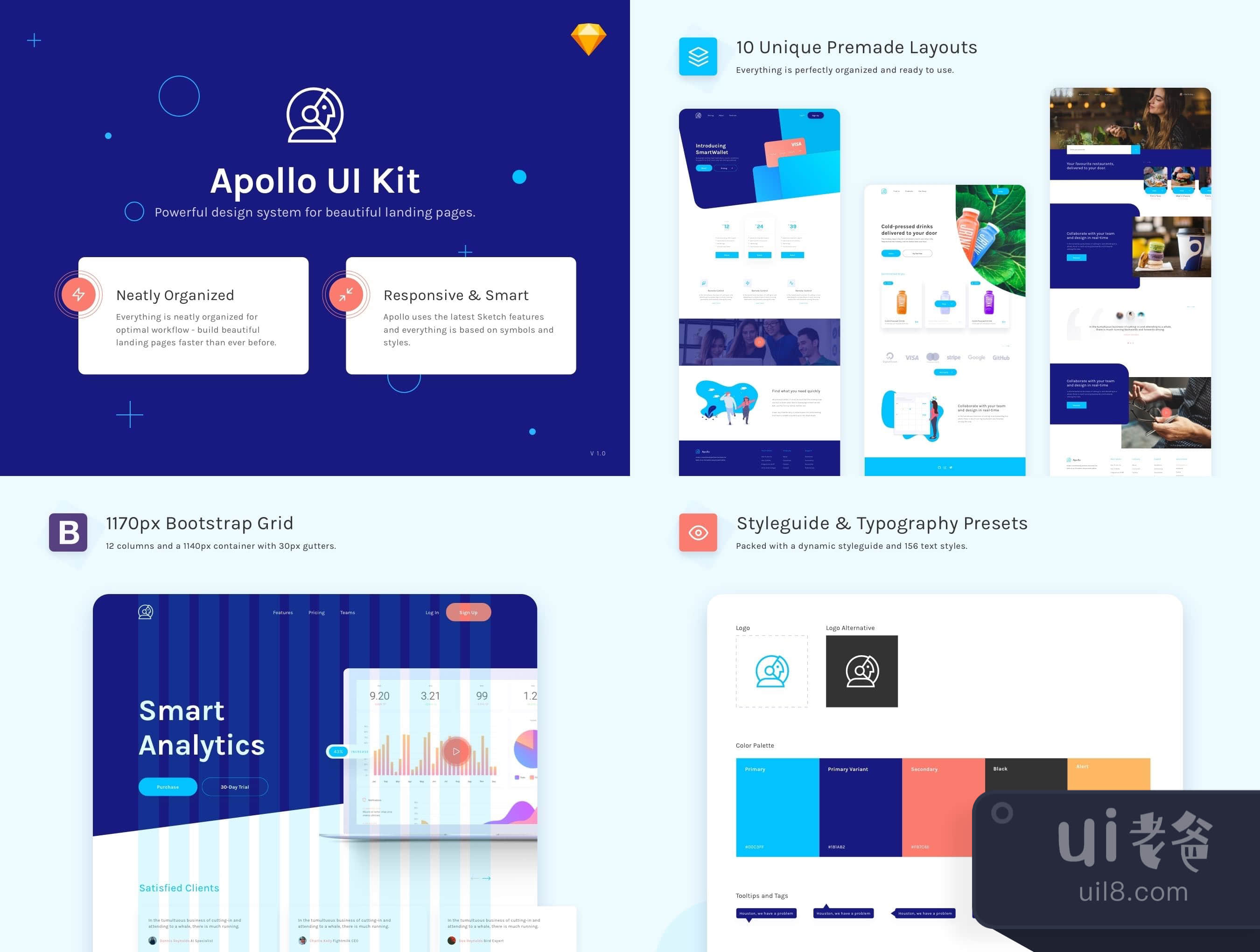 有了Apollo用户界面工具包,你可以轻松地创建美丽的网站。它配备了大量的元素,一个带有排版预设的完整动态风格指南和十个预制页面布局。所有的文件都被很好地组织、命名和分组,以优化工作流程。如果你有任何问题,请与我们联系。