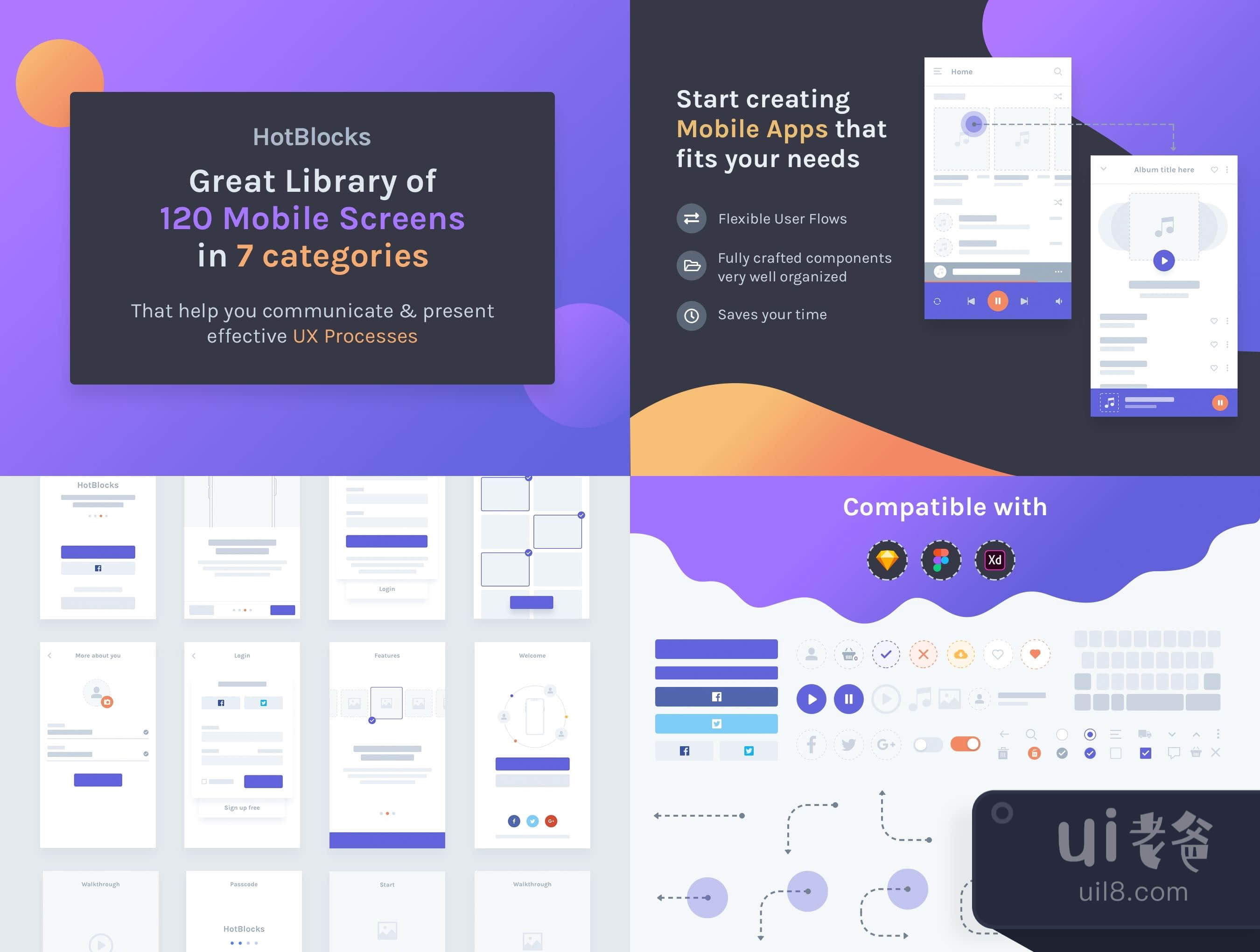 HotBlocks流程图是一个由7个类别的120个移动屏幕组成的庞大资料库,用于用户体验原型设计。它为您提供了一种更好的方式来创建美丽和有效的用户流展示。通过使用Sketch符号和使用箭头来连接艺术板,加快了你的创作过程。