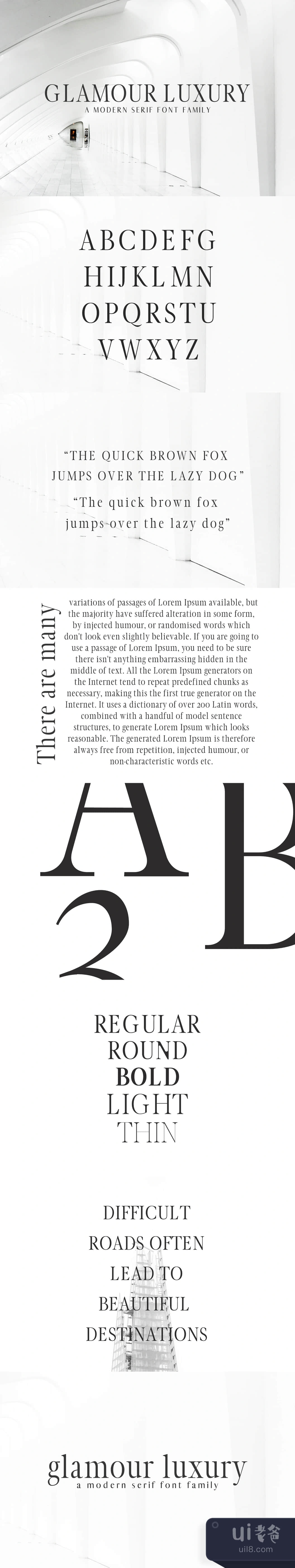 Glamour Luxury是一个现代简约衬线字体系列,有多种重量可供选择。它包括所有基本的字形和非英语字符。它可以用于标题、海报、品牌、包装、演示、标志、引言、标题、杂志标题、网页布局、广告、邀请函、包装设计、书籍以及几乎所有的创意设计。