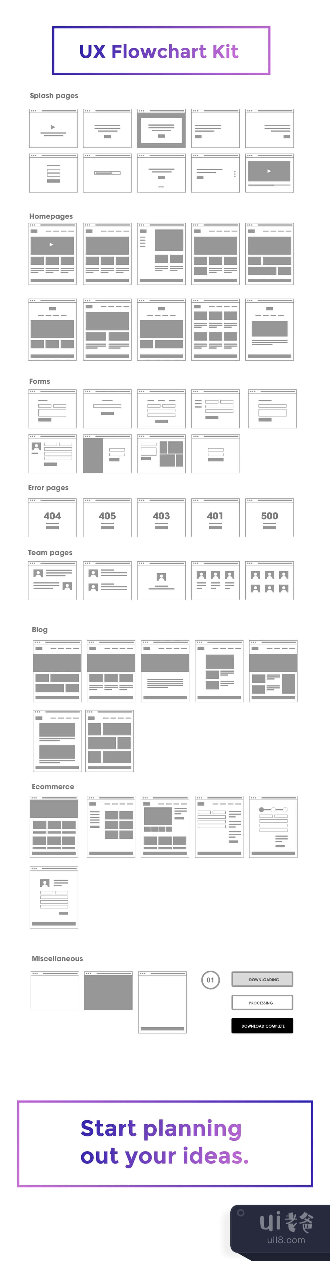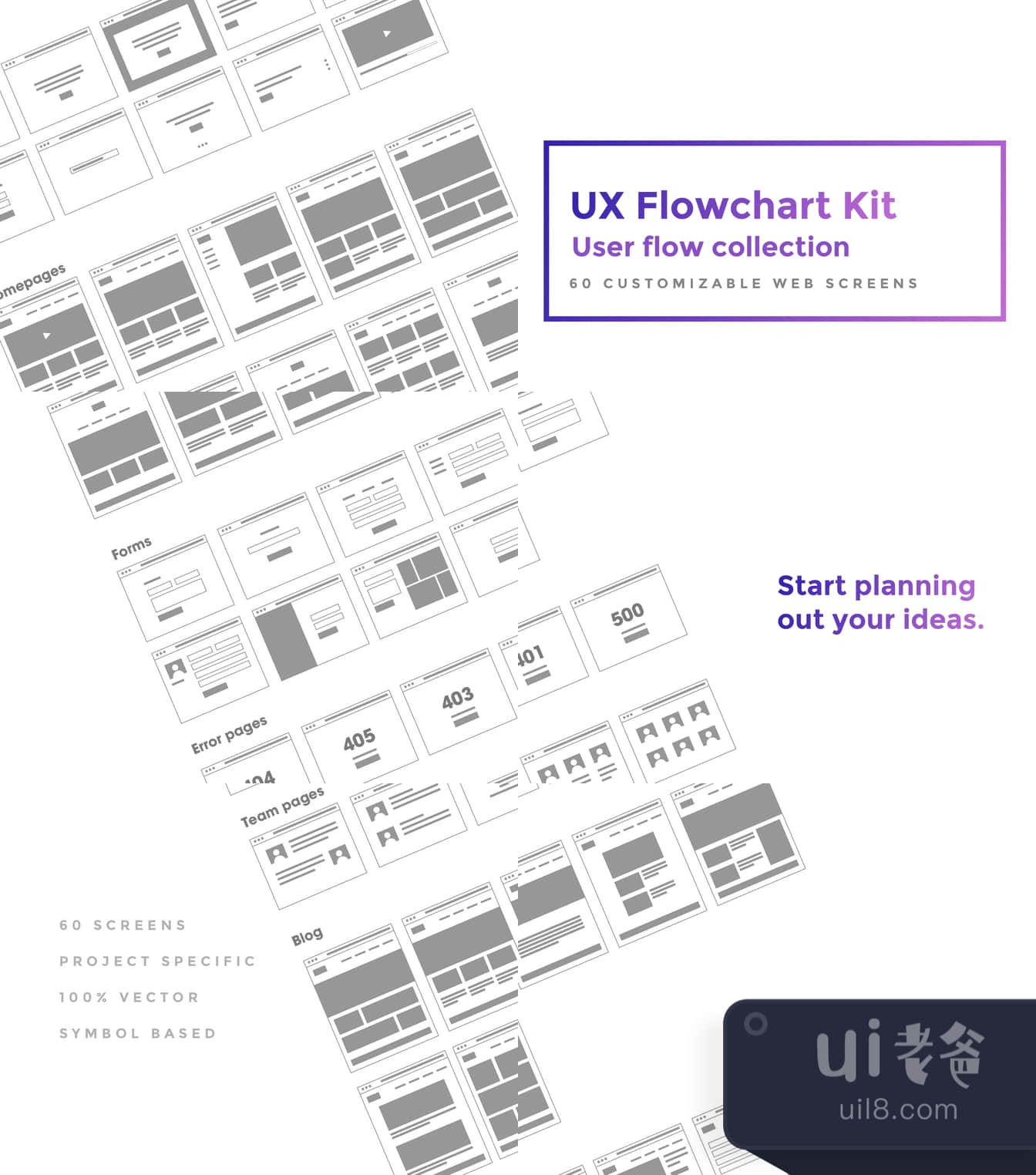 用户体验流程图工具包是一个由60个精美的网络流程图块组成的集合。这个用户体验流程图将帮助你开始构思和设计任何网络应用。在我们的Sketch文件中,你会发现9个最受欢迎的类别。幻灯片,主页,表格,错误页面,团队页面,博客,电子商务和其他。每个流程图块都是一个完全可定制的符号,特别容易使用,并在Sketch应用程序中精心分层和分组供你使用。