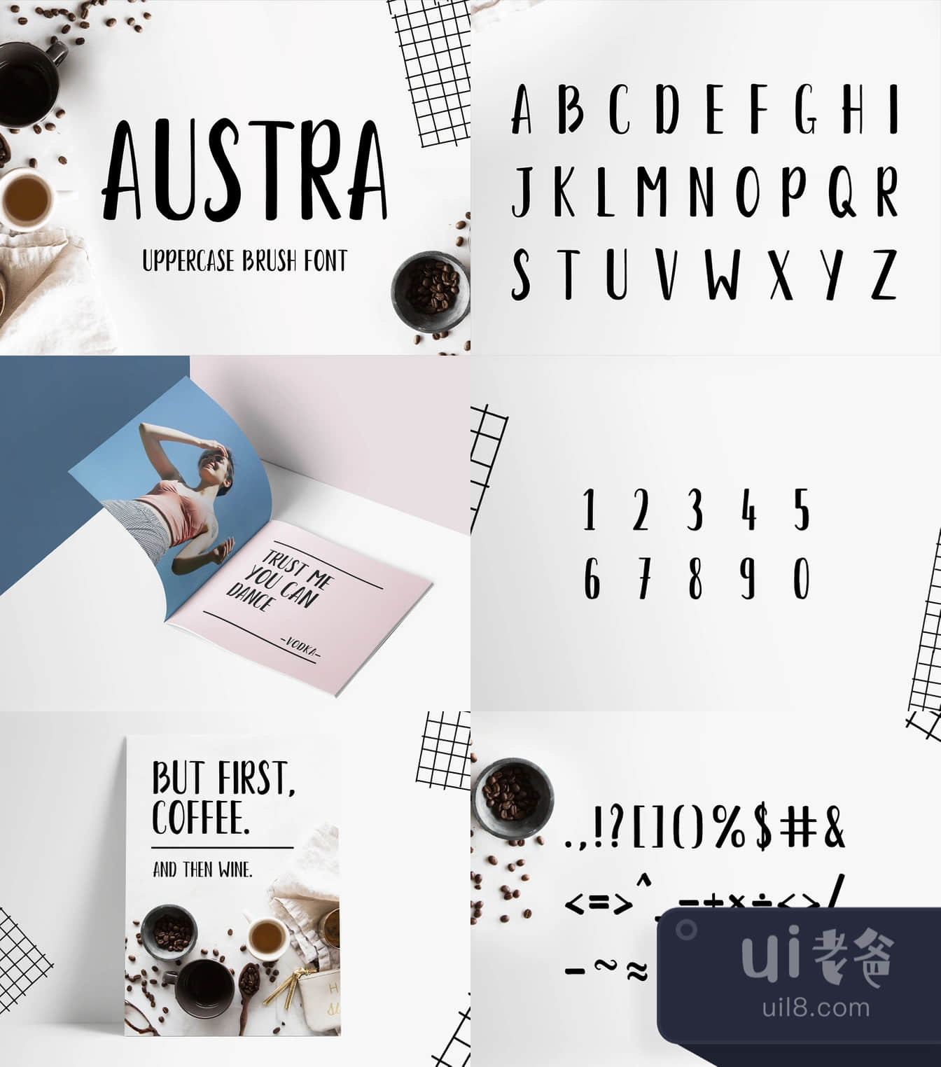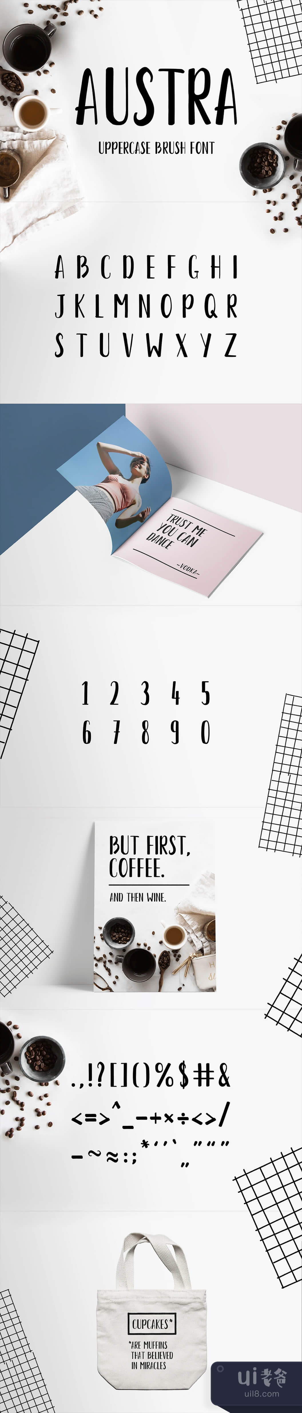Austra大写字母刷字体是一种几何刷字体,下面有一个强大的结构。它对于简短的描述、标志和品牌识别设计、包装、标题等都很适用。包括大写字母、数字、符号。包括的文件。Austra-Lite.ttf