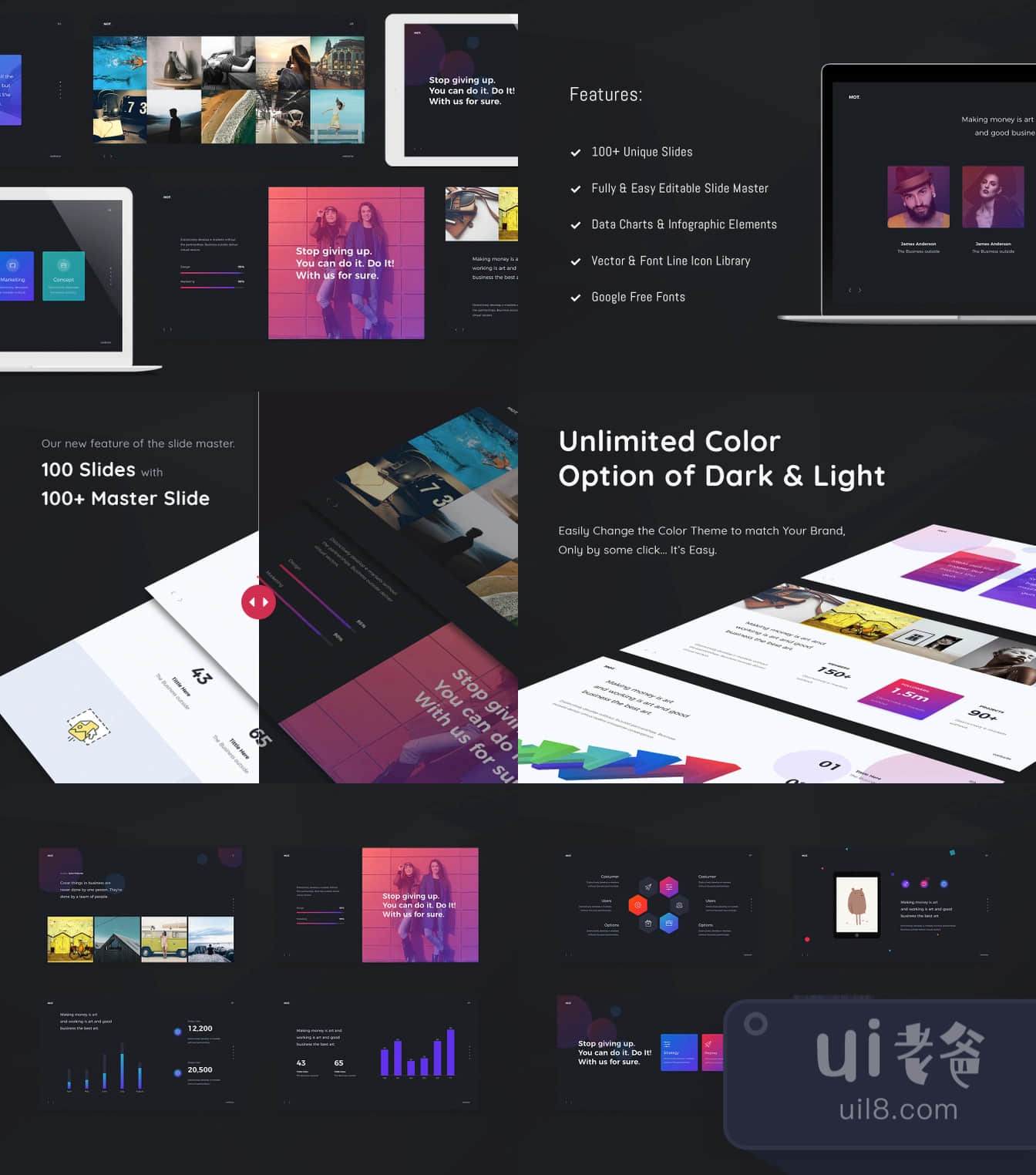 "MOT "是一个多用途和最小的Keynote模板。从创建这个模板的一开始,我们就专注于所有幻灯片的真正用途,良好的可读性和有意义的建议。我们花了很多时间在Keynote上进行测试,在那里我们成功地调整了很多细节。在与设计师的合作中,我们准备了在网页设计中使用的现代色彩,并为您带来趋势洞察力。伟大的动画提供了动态,并使你的演示有趣和独特。如果你是一个经理,想展示公司的潜力,一个渴望吸引注意力的讲师,或者一个想展示报告的学生--不要犹豫,这个产品就是为你开发的