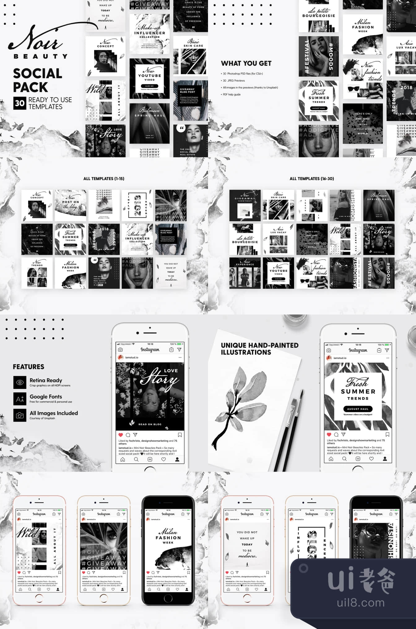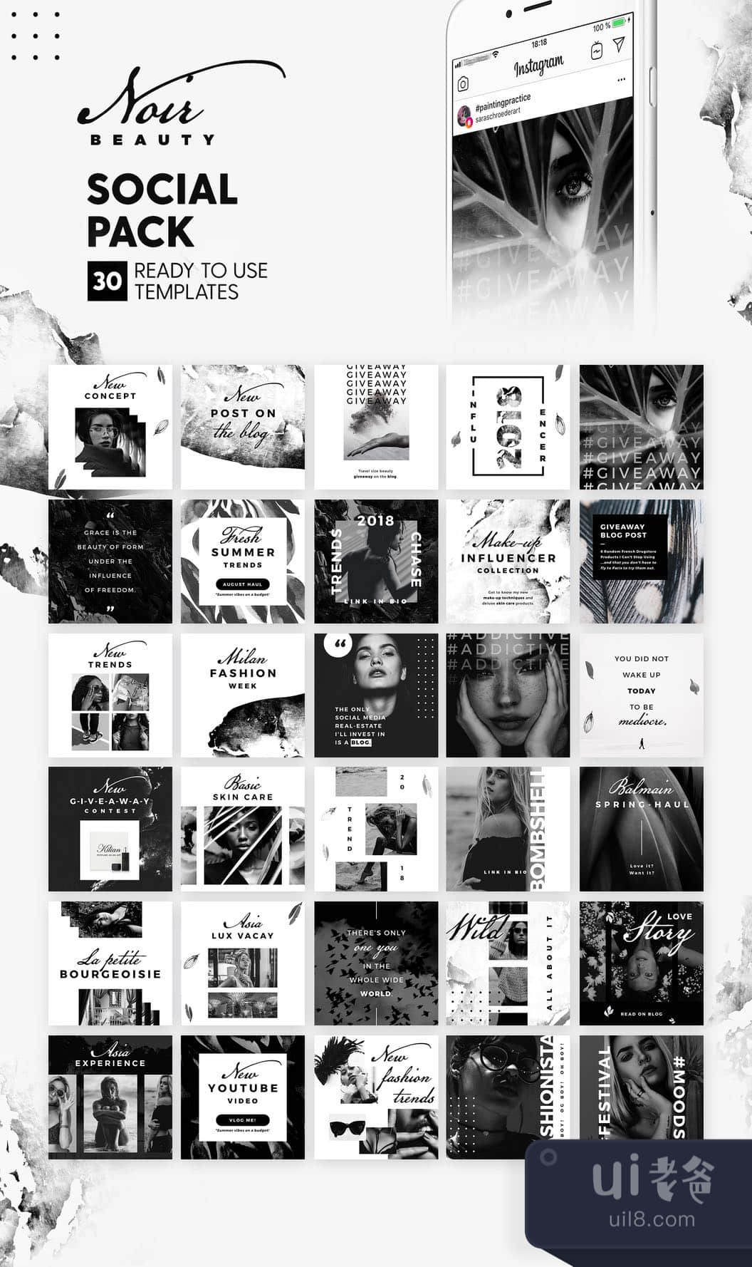 嘿,你们都是极简主义的爱好者! 有30个社交帖子设计选项可供选择,并适用于你的社交媒体战略,即使你是一个新手时尚博客,一个被炒作的影响者,或一个成熟的服装品牌。包括哪些内容。30个Photoshop PSD模板(适用于CS6+),30个JPEG预览,用于快速文件管理和随时使用的意图。预览中的所有图片,感谢Unsplash! PDF帮助指南,将协助您轻松更换照片的技巧和免费字体来源。而包中包含的快速指南一定会帮助你的次要用途:社交媒体帖子、博客、博客横幅、营销活动、品牌推广、墙面艺术、标志、引言、博客、网站。其实任何你喜欢的地方!