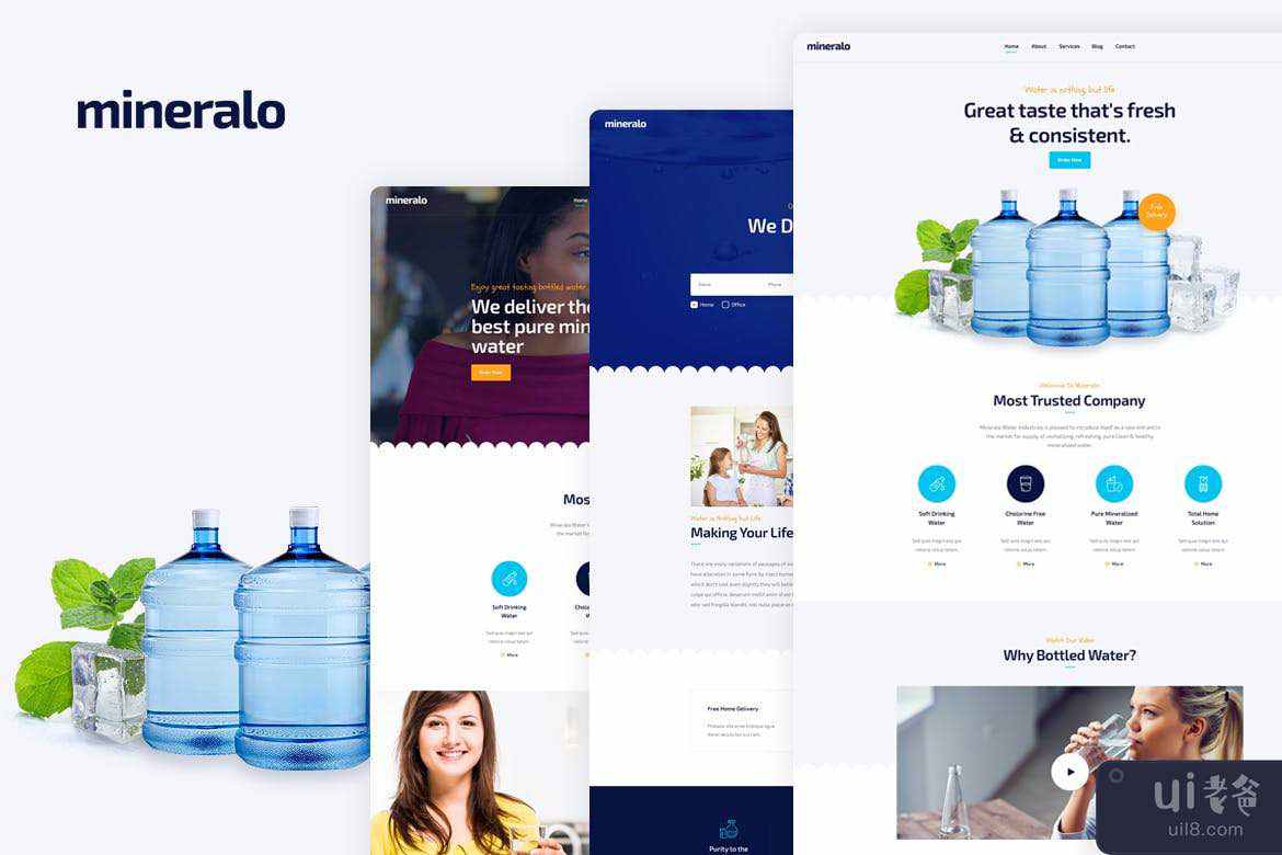Mineralo – 是专为瓶装水配送公司、送水服务、滤水器、家庭过滤器、矿泉水服务、在线水店、水开采等创建的干净且专业的 PSD 模板。特点