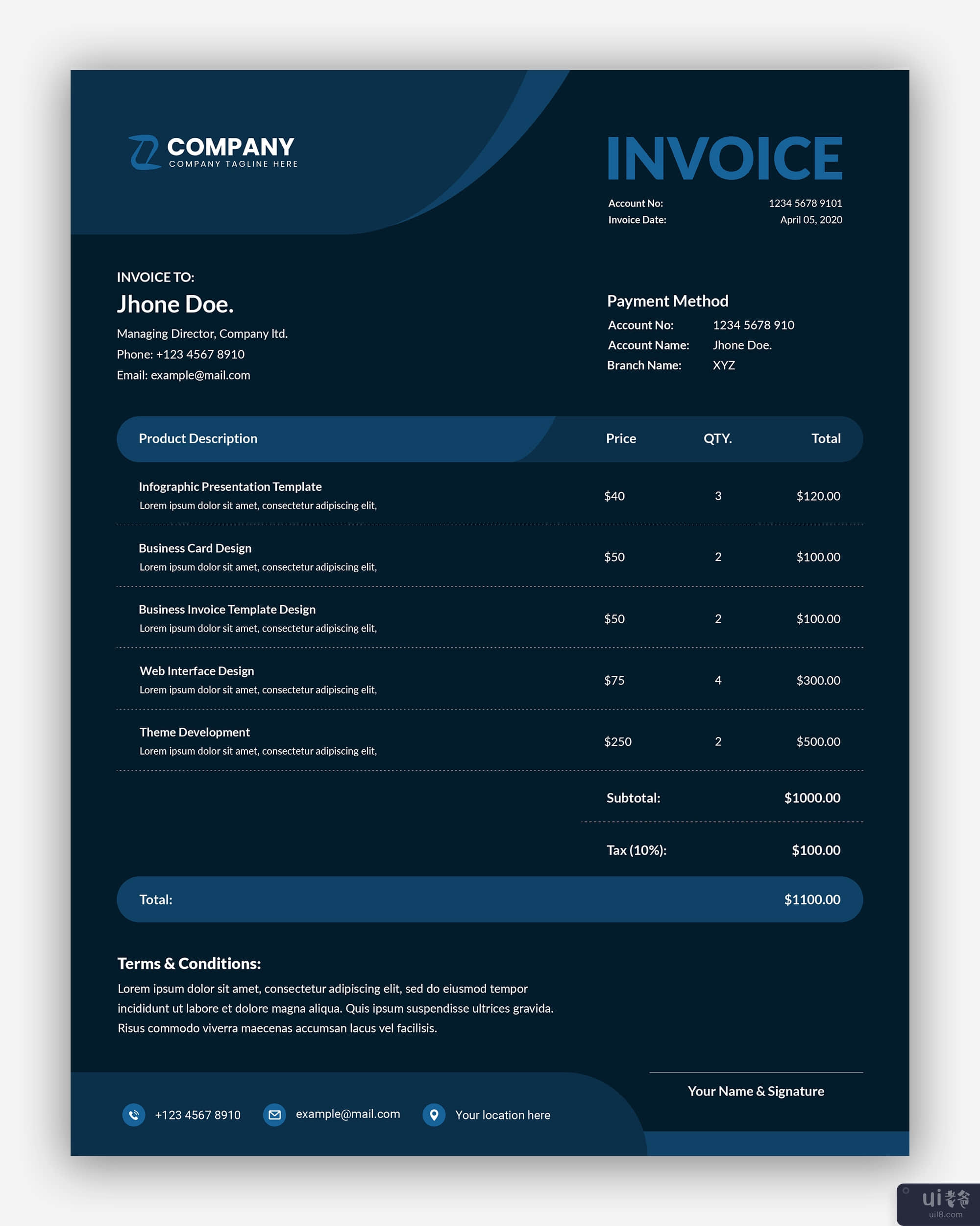 最小的企业黑暗业务发票模板(Minimal corporate dark business invoice template)
