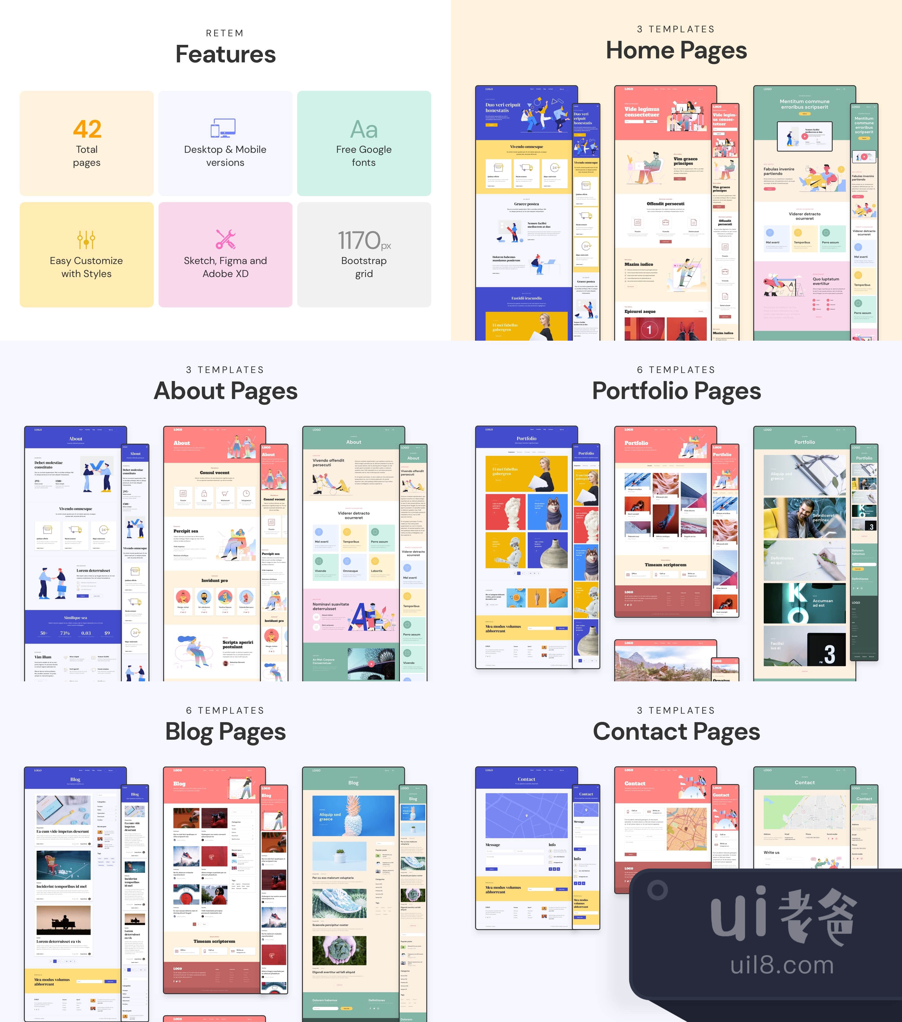 RETEM its pack of 21 responsive carefully crafted pages. Powerful and customizable themes for business, creative, modern, corporate, agency, marketing, personal, startup and etc. Pages perfectly organized and designed with latest design trends. Created in Sketch, Figma and Adobe XD.