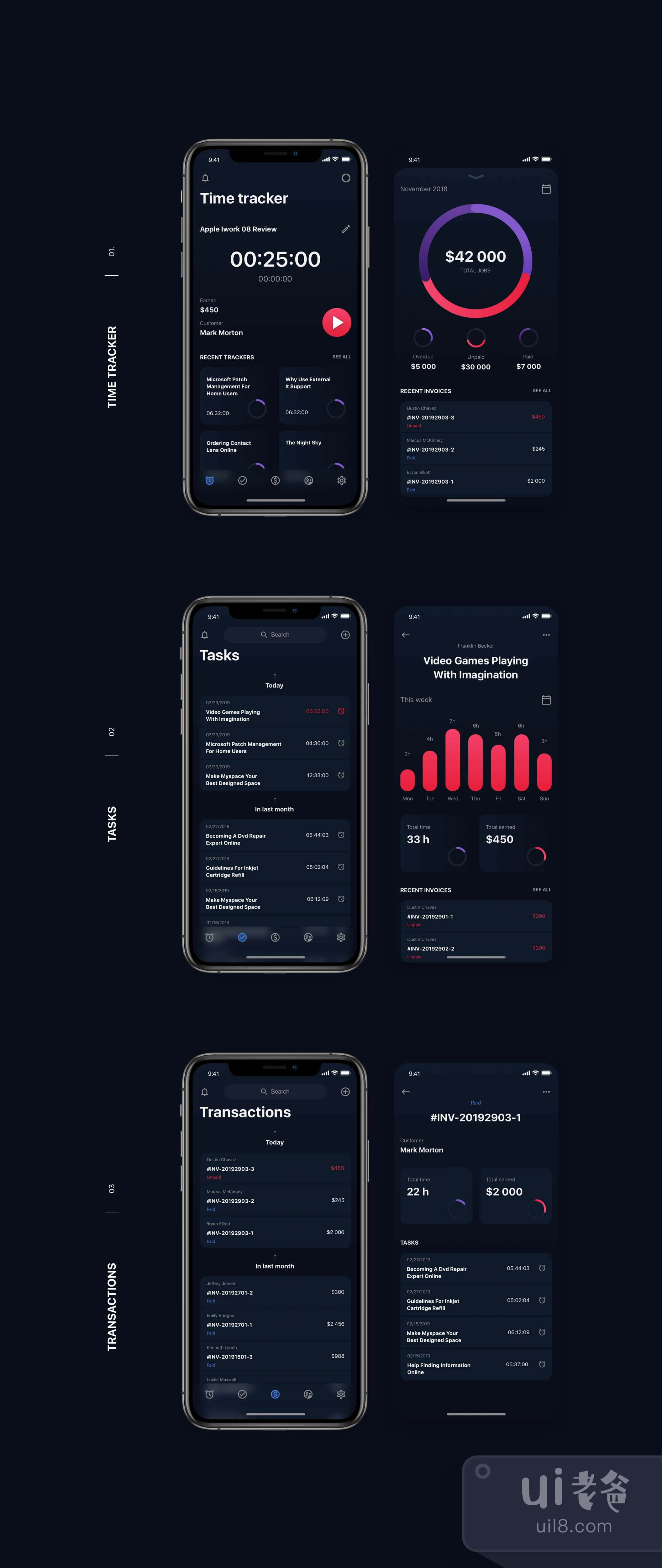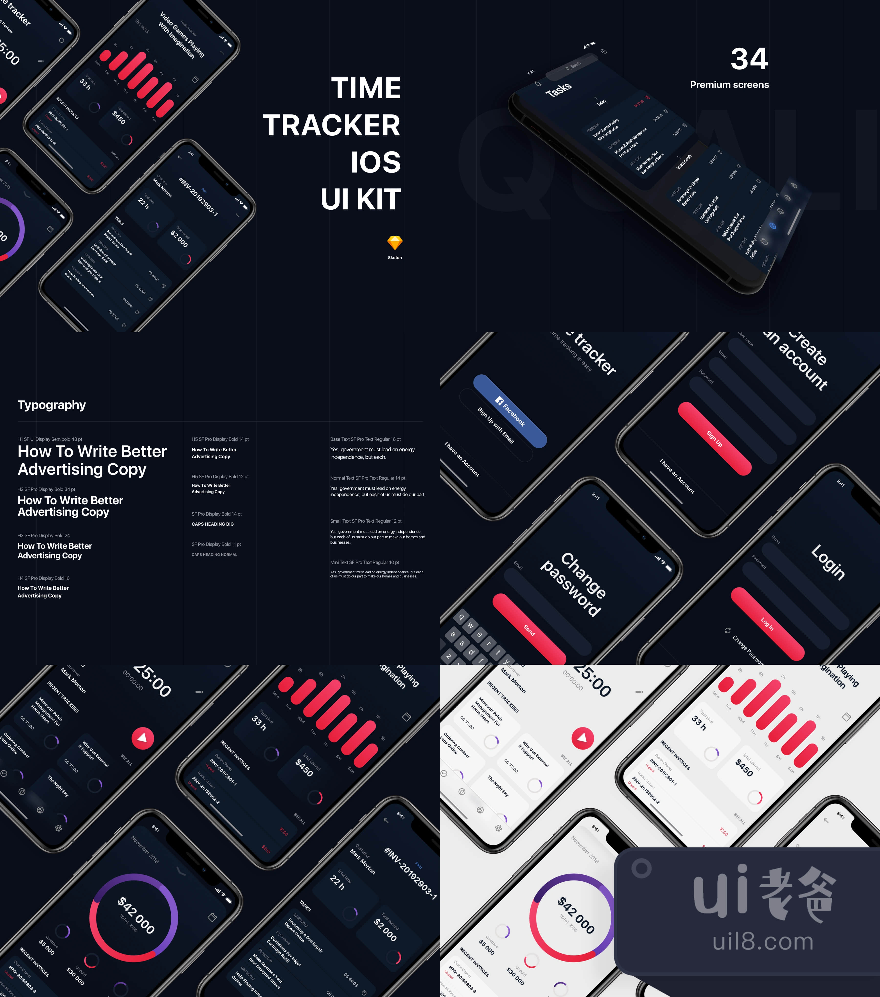 Timetracker UI Kit是30多个优质屏幕。用Sketch和Figma的高质量模板更快地创建iOS的应用程序。该文件包括所有最新的功能,如调整大小选项、文本和层样式。使用整齐的图层编排,苹果的SF字体和矢量图形图像。