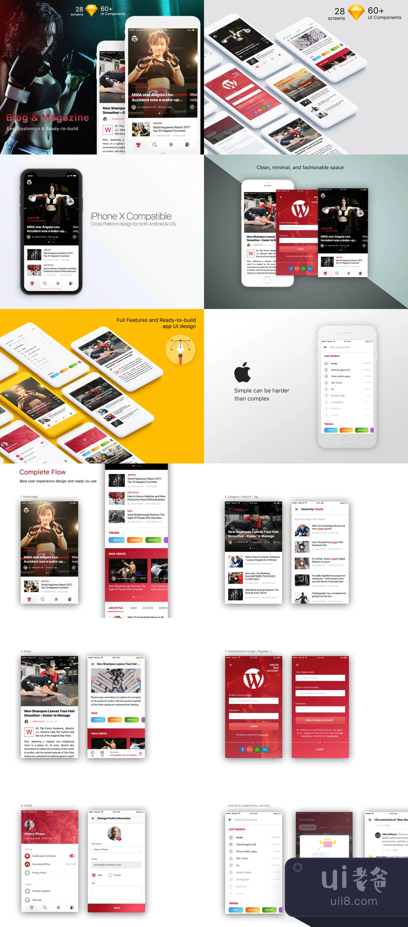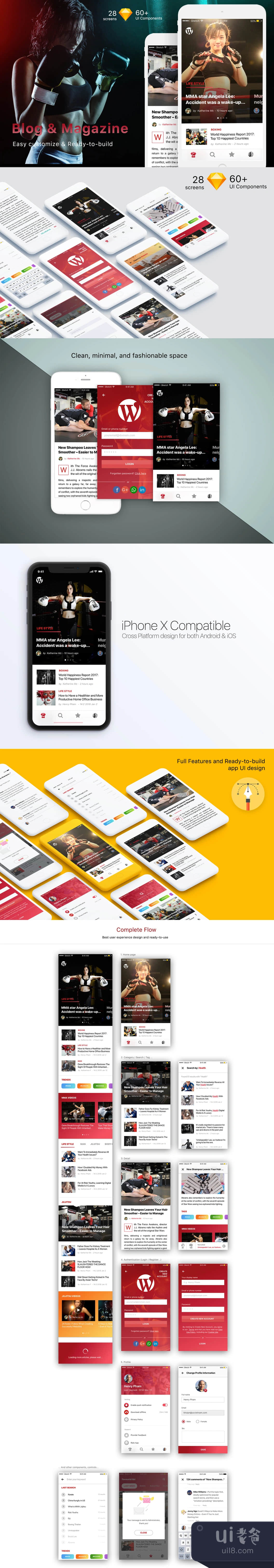 MB是独特的,干净的和现代的Sketch iOS移动设计,适用于新闻,博客,杂志和评论移动应用程序或移动网络。它是为iPhone 8设计的,但完全可以适应任何平台(Android,iOs和其他网络视图),因为它是基于矢量的。你可以设置任何颜色、背景图像、字体家族来解决任何特殊的目的。所有的UI部分都被分组在组件上,以方便定制。 这是一个基于简单、干净的设计风格和用户体验优化的高质量包,包括28个用Sketch设计的iPhone 8屏幕模板。包括最流行的类别(登录/注册,主页,类别,搜索,标签,详细帖子,评论,分享,个人资料,社会等)。