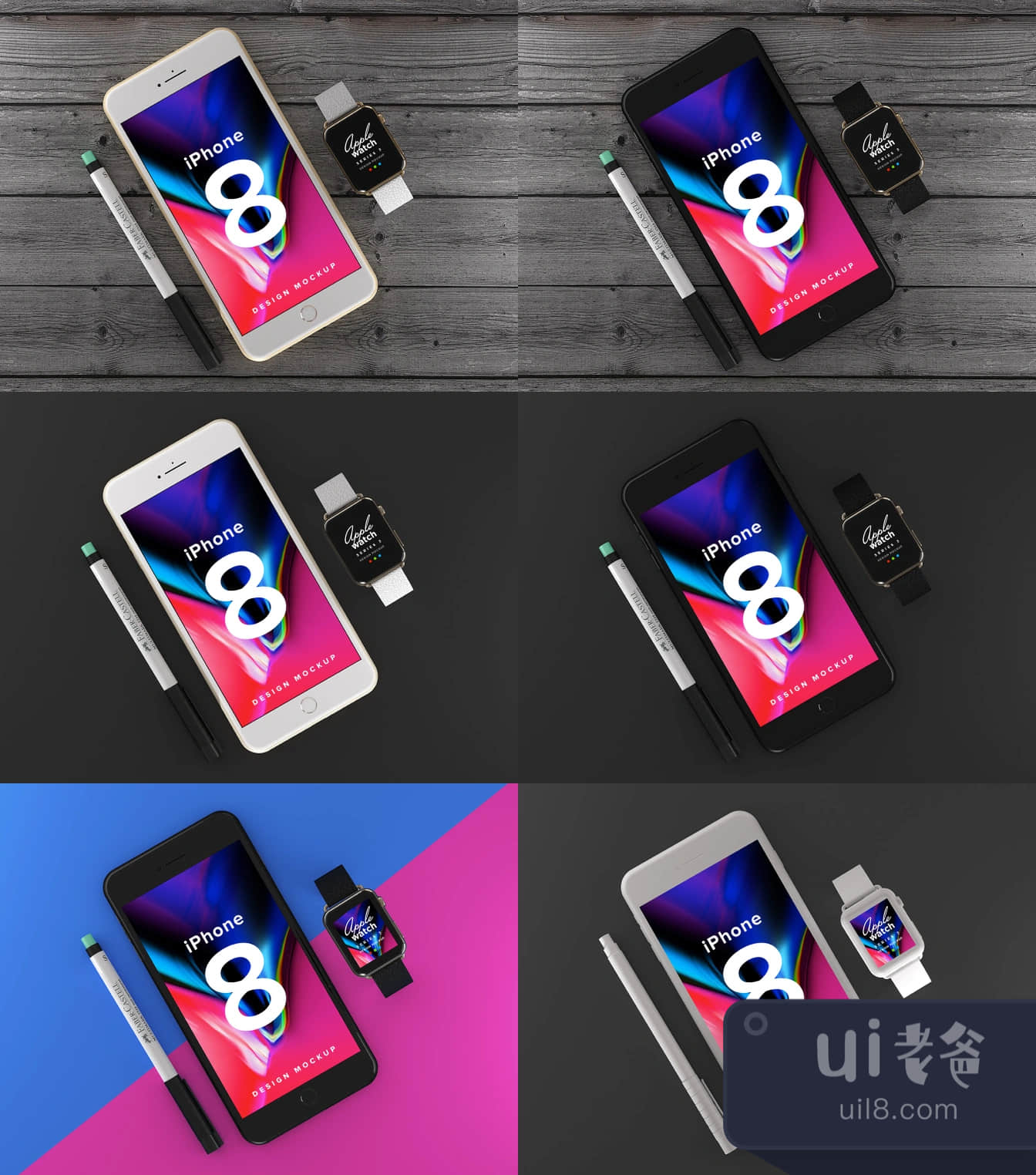 一个高分辨率的iPhone 8和Apple Watch的Photoshop文件。以6000px乘4800px的高分辨率,200dpi创建,以保持最高的图像质量,适用于各种使用情况。