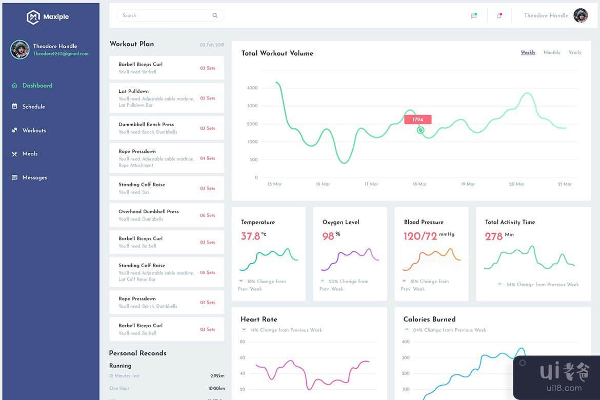 Maxiple - 健身管理仪表板 UI 套件:Maxiple 是一个现代设计仪表板 PSD 模板。专为健身管理员管理仪表板设计。它包含 10 个 PSD 文件,具有组织良好的矢量图层。此模板的主要特点: