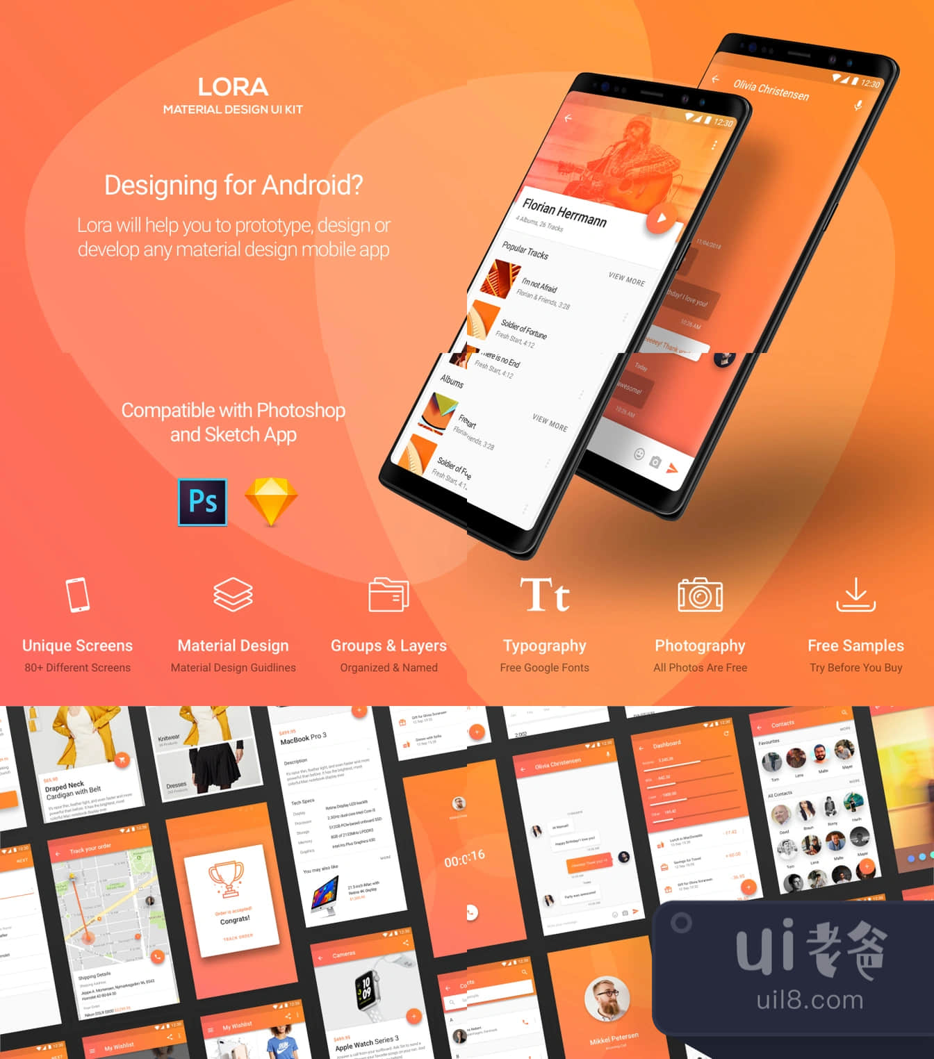 Lora Material Design是一个巨大的UI工具包,包含12个类别的80多个材料设计屏幕。每个屏幕都是完全可定制的,特别容易使用,并在Sketch应用程序和Adobe Photoshop中精心分层和分组。这是你在Sketch或Photoshop中快速制作原型、设计和开发任何材料设计应用程序所需要的。你可以用它来设计社交网络应用程序,仪表盘和统计应用程序,媒体和新闻应用程序(博客,视频,画廊...),电子商务应用程序(商店,商店),预订应用程序,音乐和更多...享受吧!