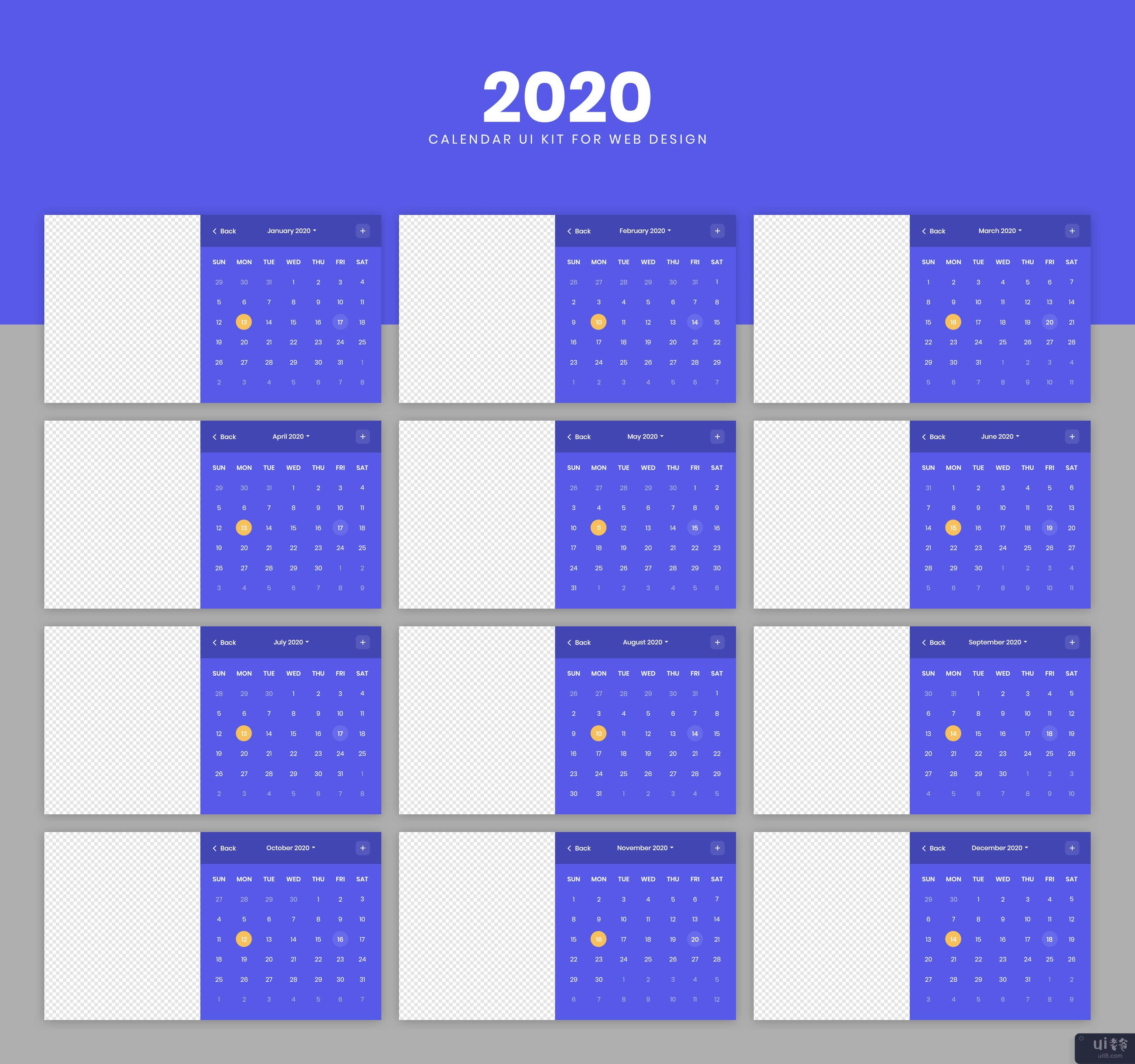 用于网页设计的带有图像支架的日历 ui 套件