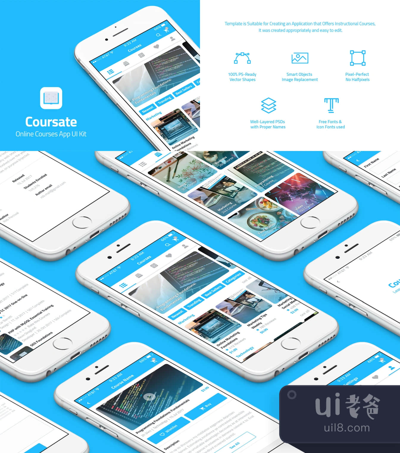 Coursate UI Kit is suitable for creating an application that offers Instructional Courses online. All screens were designed appropriately and are easy to edit. High quality pack of 30 android or ios compatible mobile UI screens to start your projects and speed up your design process. All screens are vector based so resizing to fit your needs is easy! Coursate UI Kit is compatible with Photoshop.