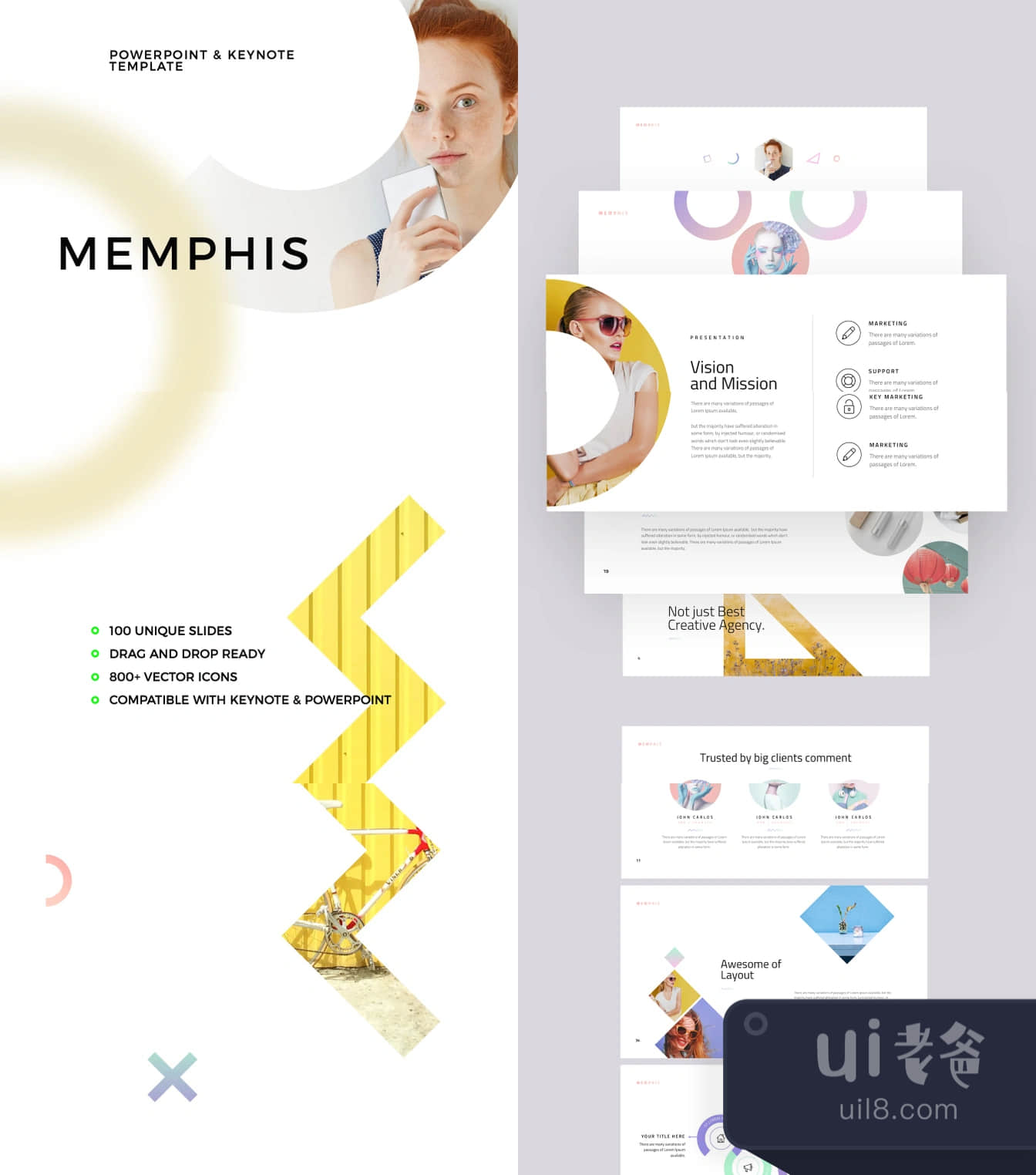 一个强大而有创意的幻灯片演示,可用于PowerPoint和Keynote。它有100多个独特的演示幻灯片,具有伟大的专业布局和创意设计。Memphis使得改变颜色、修改形状、文本和图表变得容易,所有形状都可以编辑。包括一套精彩的800个矢量图标和苹果设备模拟图。