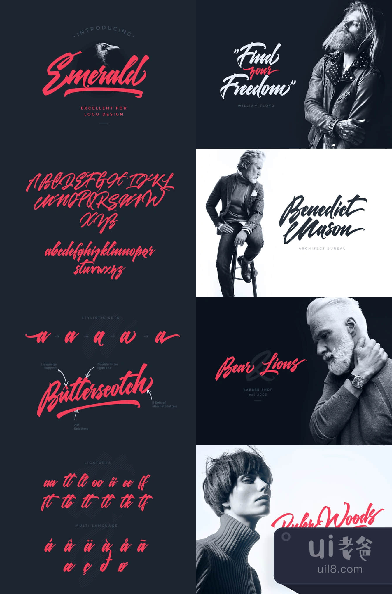 Emerald是用于标志设计的字体包! 这种正常的字体与交替的字符相结合,使每个字都很独特。然后再加上Splatters字体作为你的标语, viola,这就是理想的标志了! 绿宝石字体有绿宝石正常OTF和TTF,绿宝石溅射OTF和TTF,绿宝石正常Web字体WOFF和WOFF2。