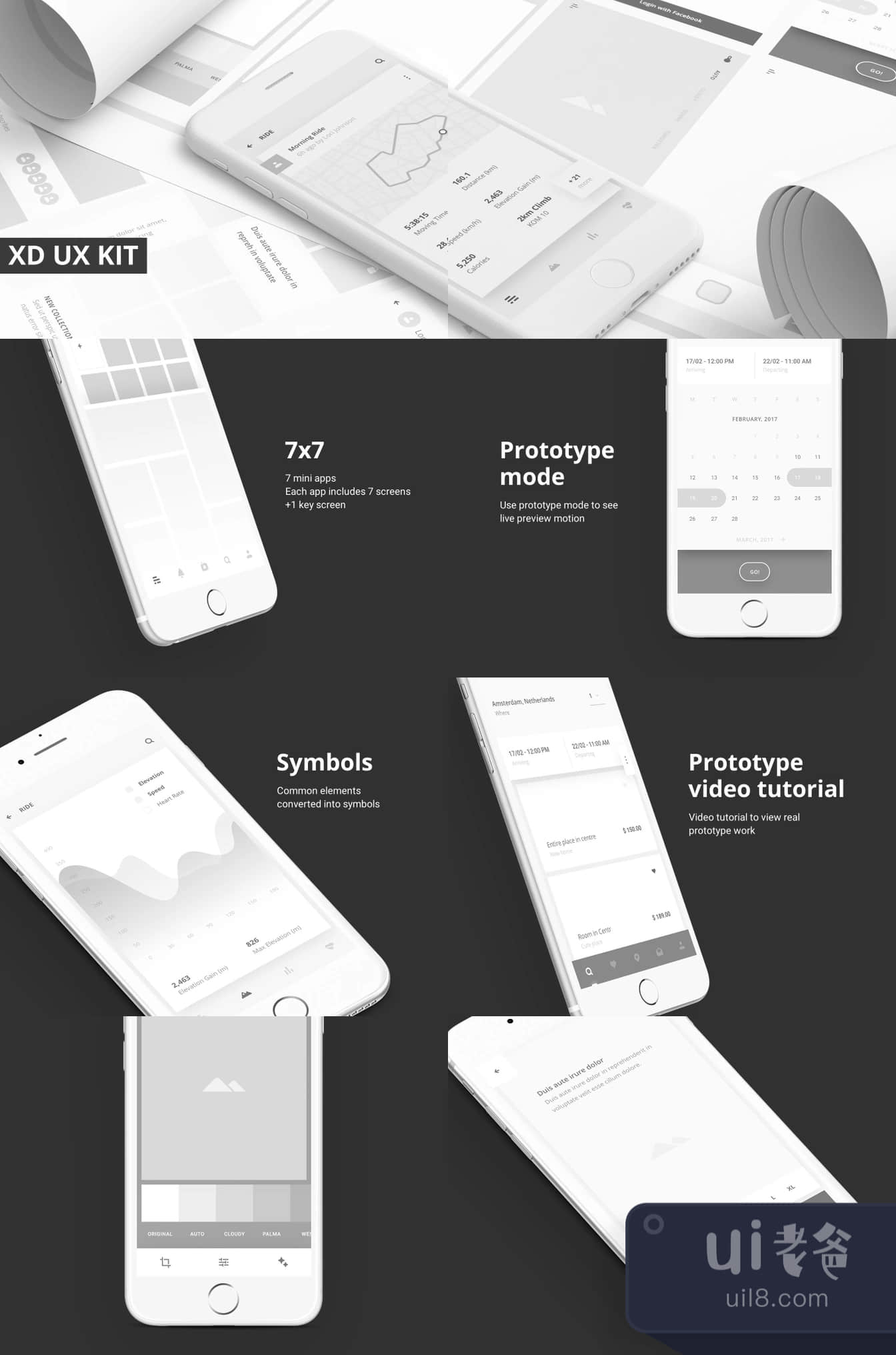 这就是,时尚、现代、全新的XD用户体验套件。这是为Adobe XD专门设计的完美的移动线框套件。包括7个迷你应用程序,每个应用程序包括7个屏幕+1个关键屏幕。所有常见的元素都转换为符号。我们还包括一个免费的视频教程,因此你可以查看你的真实原型作品。