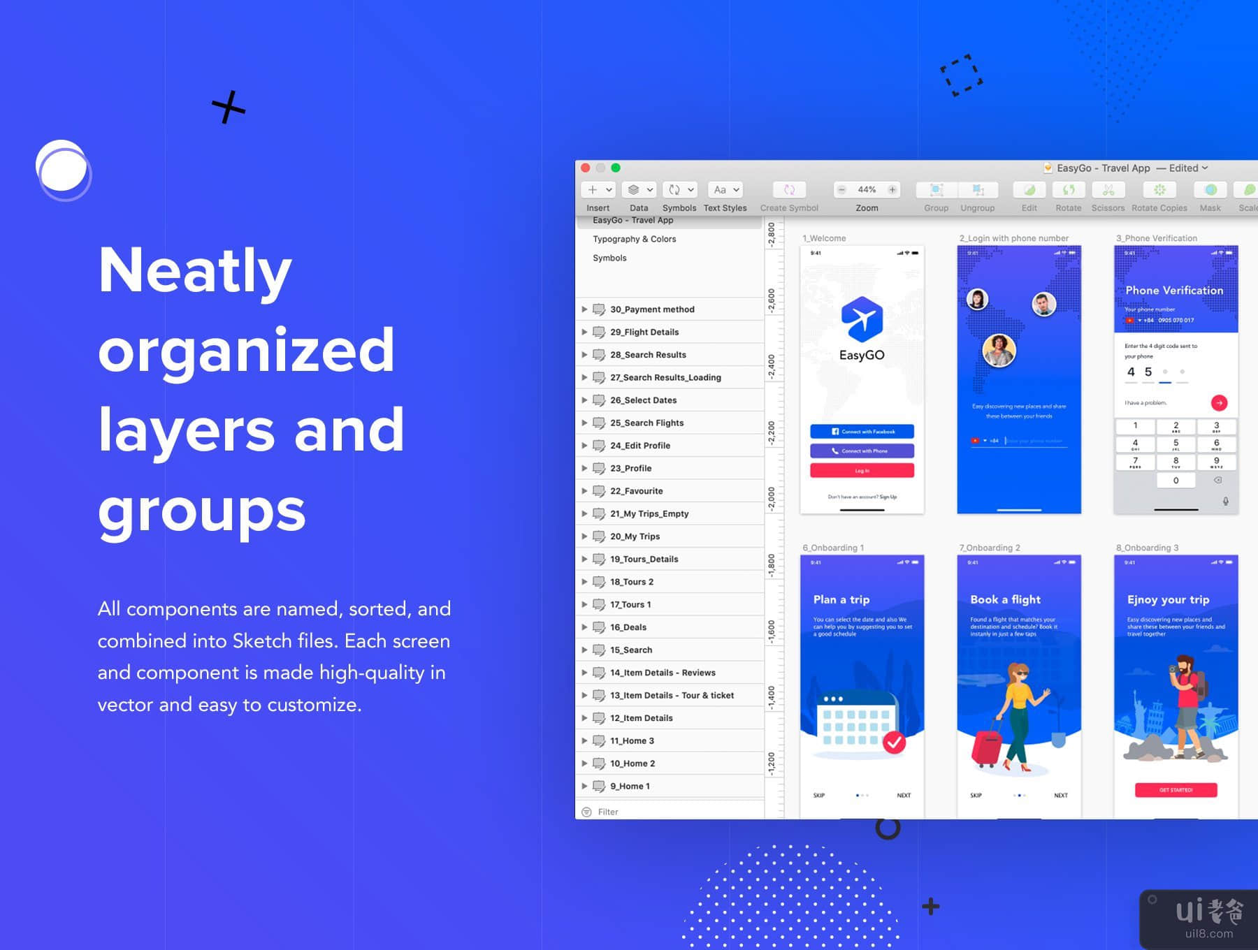 EasyGo - Travel App UI Kit 是一个高质量的包,包含 30 多个屏幕,旨在启动您的旅行项目并加快您的设计工作流程。此套件 100% 兼容 iOS &安卓系统。精心打造的 UI 符合现代设计趋势、清新的色彩和动态的 UX。这个现代设计模板易于定制,让您更轻松地设计下一个应用程序。