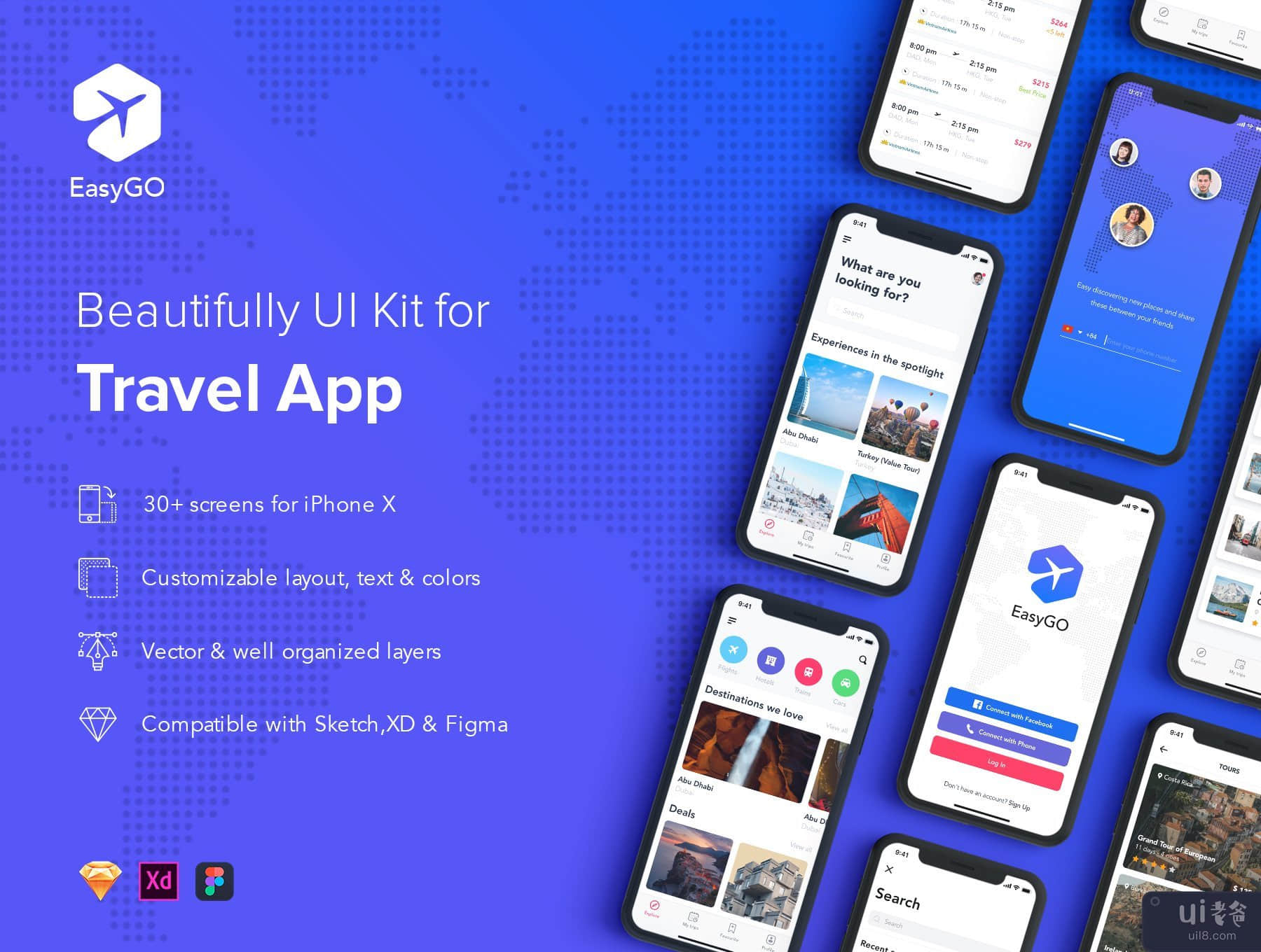 EasyGo - 适用于 ADOBE XD 的旅行应用程序 UI 套件(EasyGo - Travel App UI Kit for ADOBE XD)